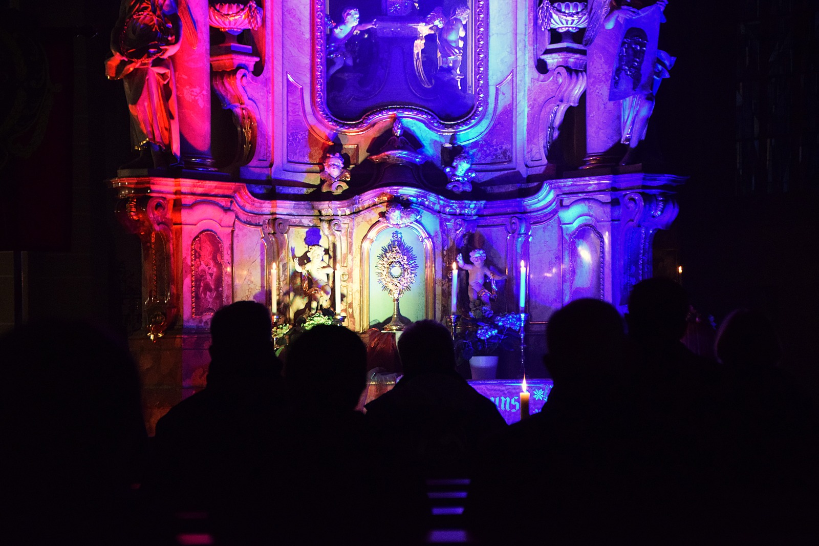 Nach der Wallfahrtsmesse begann der eigentliche Abend der Hoffnung. Unschwer zu erkennen war beim Betreten der Kirche der farblich beleuchtete Altar, was auch einen besonderen Grund hatte: Im Mittelpunkt stand Jesus Christus, welcher im gewandelten Brot (Hostie) in der Monstranz auf dem Altar ausgesetzt war, um so seine Präsenz darzustellen. In wechselnder Besetzung wurden während des gesamten Abends modere Lobpreislieder gespielt sowie Meditationsimpulse aus dem Sonnengesang vom Heiligen Franz von Assisi vorgetragen, welche bei den Besuchern sehr gut ankamen. Dazwischen war auch Zeit für das persönliche Gebet in der Stille. Während der gesamten Zeit der eucharistischen Anbetung konnte man in der Bank knieend oder sitzend verweilen oder auch im Altarraum vor dem Allerheiligsten knien, eine Kerze anzünden oder eine Bibelstelle ziehen.