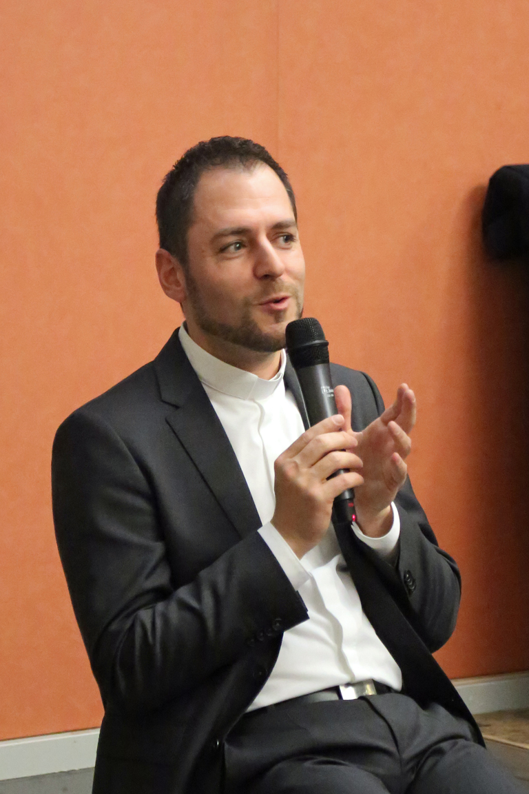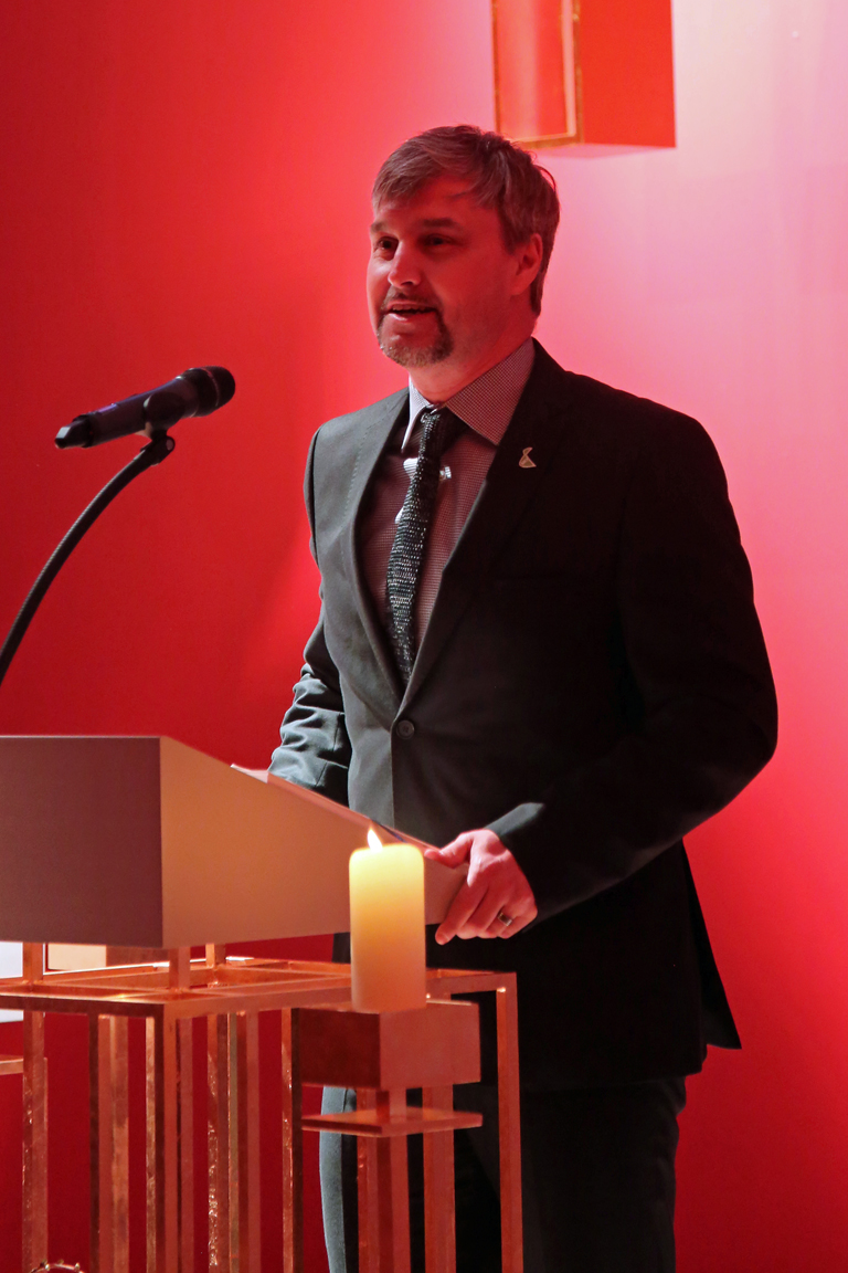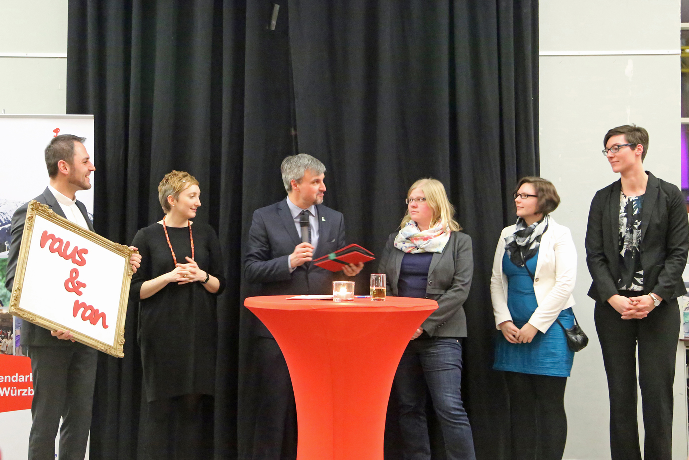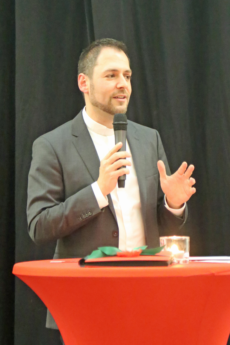 Vor der Feierstunde zelebrierte Domkapitular Warmuth einen Gottesdienst in der Jugendkirche. Das Motto „Raus & ran“, das Michelberger geprägt hat, stand auch im Mittelpunkt der Predigt von Matthias Zöller. Zunächst zeigte eine Diashow unterschiedliche Orte: die Türme des Kiliansdoms, ein mit Graffiti beschmierter Altglascontainer, Cafétische oder Punks am Hauptbahnhof. „Es waren ein paar Orte dabei, wo Du gerne bist und wo Du gerne hingehen würdest“, erklärte Zöller. „Stefan sucht nach der Begegnung mit dem Anderen, der neuen Erfahrung, dem Erleben von Grenzen.“ „Raus & ran“ sei aber auch ein Motto, das der Kirche und der kirchlichen Jugendarbeit gut zu Gesicht stehe. Denn nur, wenn man aus sich selbst herausgehe und die Begegnung mit anderen Menschen wage, begegne man Gott. Deshalb sei „Raus & ran“ eine klare Absage an eine „Wagenburgmentalität“, an eine aseptische Kirche, die sich auf Gesetze und Normen zurückziehe. „Wir müssen jetzt handeln und nicht zaudern, wir müssen ganz in der Gegenwart stehen und nicht der Vergangenheit nachweinen“, sagte Zöller. Er forderte die Anwesenden auf, diesem Programm Michelbergers zu folgen. „Ich wünsche uns, dass wir seinem Mut folgen und uns immer wieder an die Peripherien des Lebens wagen. Ich wünsche aber auch ihm den Mut, die Entschlossenheit und Ausdauer, dieses Lebensmotto in seiner neuen Aufgabe und an seinem neuen Wirkungskreis zu verwirklichen.“