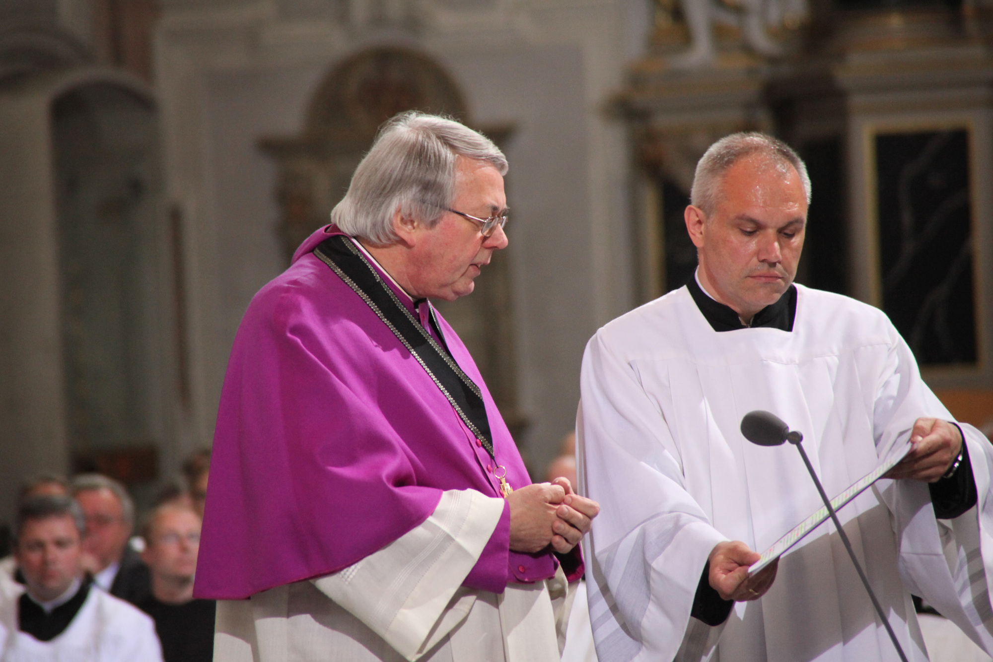Von Papst Johannes Paul II. stammt der Satz „Glaubenszeugen verweisen auf Gott und führen gleichzeitig Menschen zusammen.“ Dies zeigt sich gerade heute in unserer Gottesdienstgemeinschaft. Viele aus allen Teilen unseres Bistums und darüber hinaus haben sich hier eingefunden. Uns alle verbindet die Freude über einen Priester, dessen Glauben sich in schwerer Zeit bewährt hat und dessen Haltung auch uns Hoffnung vermitteln kann. So heiße ich Sie im Namen unseres Bischofs sowie des Domkapitels ganz herzlich willkommen und grüße jeden Einzelnen hier im Dom und an den anderen Plätzen, an die unsere Feier übertragen wird.