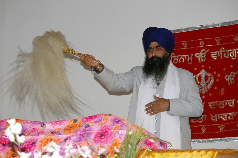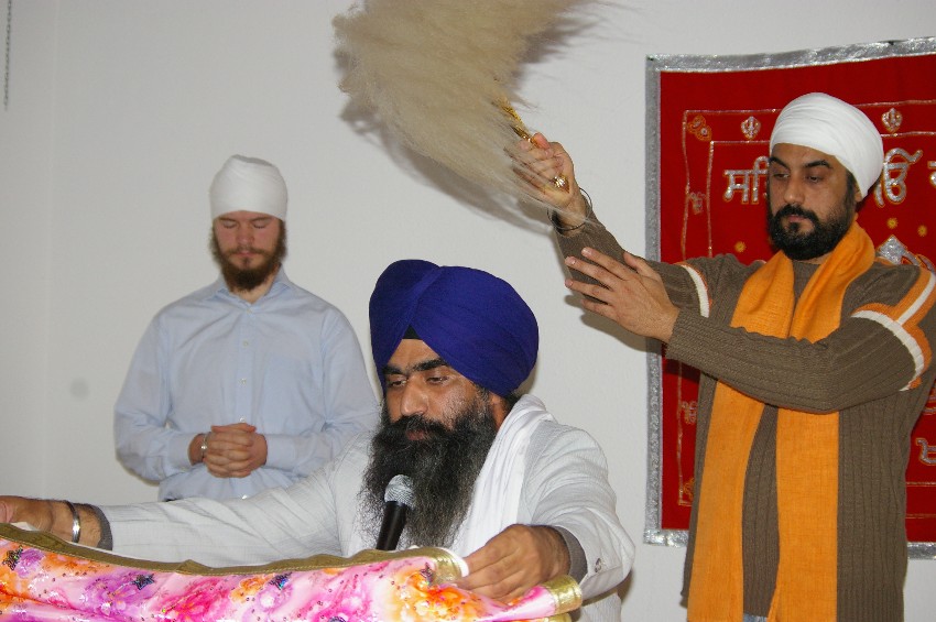 Im Tempel der Sikhs wurden die Teilnehmerinnen und Teilnehmer von Granthi, einem indischen Priester, begrüßt. Er ist seit dieser Woche in Würzburg und wird für ein Jahr im Würzburger Tempel leben. Nach der Begrüßung im Tempel durften die Besucher an einer kleinen Gebetsfeier der Sikhs teilnehmen. Dabei waren sie besonders begeistert von indischem Gesang und der Trommelmusik, welche die Zeremonie umrahmten.