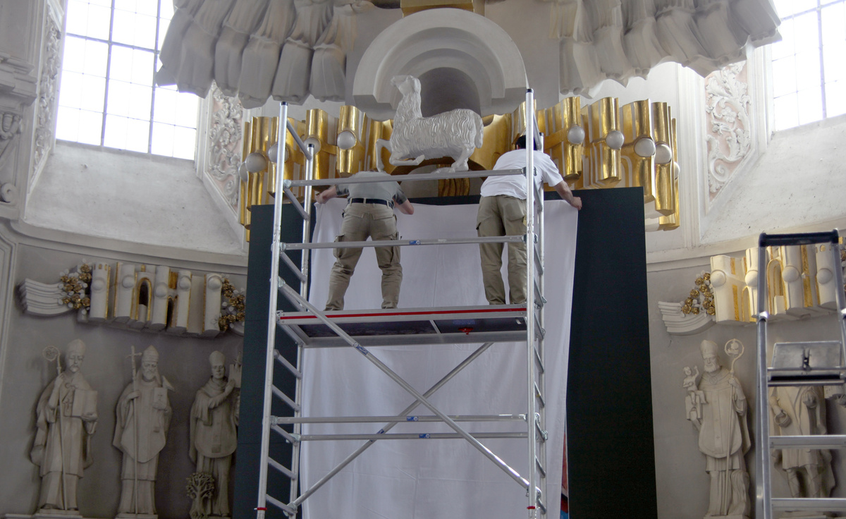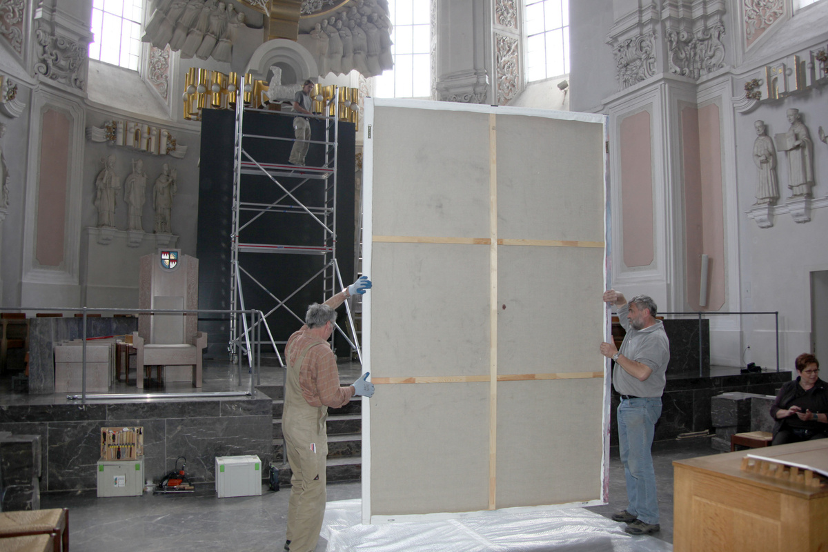 Würzburg (POW) Mit Hochdruck sind am Freitag, 13. Mai, die letzten Vorbereitungen für die Seligsprechung des Märtyrerpriesters Georg Häfner fortgesetzt worden. Handwerker montierten das vom Veitshöchheimer Künstler Helmut Booz geschaffene, drei auf zwei Meter große Porträt des künftigen Seligen in der Apsis des Kiliansdoms. Es wird am Sonntag, 15. Mai, im Gottesdienst enthüllt. Ein Team des Bayerischen Fernsehens baute im Dom Beleuchtungsanlagen auf, die für die Live-Übertragung benötigt werden.