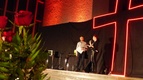 klar zu stellen, worum es geht, wurde der Studentenseelsorger Dominik Gehringer von Franziska Rebhan interviewt, was das eigentlich soll "Erotikmesse". Er stellte klar, dass die Kirche leibfreundlich ist und Christen an einen Gott glauben, der Mensch geworden ist mit Haut und Haar, der geküsst wurde und der mit Passion lebte und starb und leiblich wieder auferstand. Christian Ammersbach, der dem Gottesdienst vorstand, ordnete dann den Begriff Erotik ein. Im Griechischen stehen für den deutschen Begriff "Liebe" Eros, Philia und Agape. Auf der Linie, die Papst Benedikt in seiner Enzyklika "deus caritas est" zeichnet, stellte er die Größe und die Gefahr des Eros dar. Weil die Fixierung auf den Eros auch viel Unheil anrichten kann wurde am Ende des Gottesdienst auch für Solvodi gesammelt, eine Einrichtung, die sich um Frauen kümmern, die in Zwangsprostitution geraten sind. Nach einem "Vorspiel" mit Textpralinen aus Zitaten von Benedikts "Deus caritas est" gab eine Einführung in das Hohelied. Als Appetizer wurden Bilder mit Sätzen aus dem Hohelied gezeigt, bevor Dina Kuhnen und Linus Trapp in sehr sinnlicher Weise eine längere Passage aus dem Lied der Lieder vortrugen. Zum Evangelium, das von der Frau berichtet, die Jesus die Füße salbt, wurde ein eigens für den Anlass gedrehter Film gezeigt, der die Ganzheitlichkeit des Evangeliums eindrucksvoll unterstrich. Statt Fürbitten zu lesen, konnte jeder gedanklich seine eigenen Verletzungen mit der eigenen Körperlichkeit und Sexualität in die Schalen mit Brot und Wein legen. Die Schale wurde von Johanna Puzik mit viel Charme zur Wandlung gebracht. Die Eucharistie sollte verdeutlichen, dass es dabei auch um eine Vorwegnahme des himmlischen Hochzeitsfestes geht, um Einswerden, Verschmelzen, um das "unter die Haut Gehen" Gottes , dessen Liebe "durch den Magen geht". Letztlich wurde bei diesem mit Rosen erfüllten Gottesdienst sinnenfällig etwas gefeiert, was die christliche Mystik schon lange kennt. Im Anschluss waren die ca. 150 BesucherInnen eingeladen, noch einen Rosensecco zu trinken, sich am Büchertisch zu informieren, was zu diesem Thema sonst in der Kirche geschrieben wird, sich mit fairer Schokolade oder Duftöl einzudecken, sich bei Solvodi zu informieren, in der orientalischen Selfie - Ecke zu fotografieren oder aber sich mit Rosenöl salben zu lassen. Vielen Dank an Bettina Schwarz für die Rosenspende und an die Gruppe Suncha di lala für die tolle musikalische Begleitung.