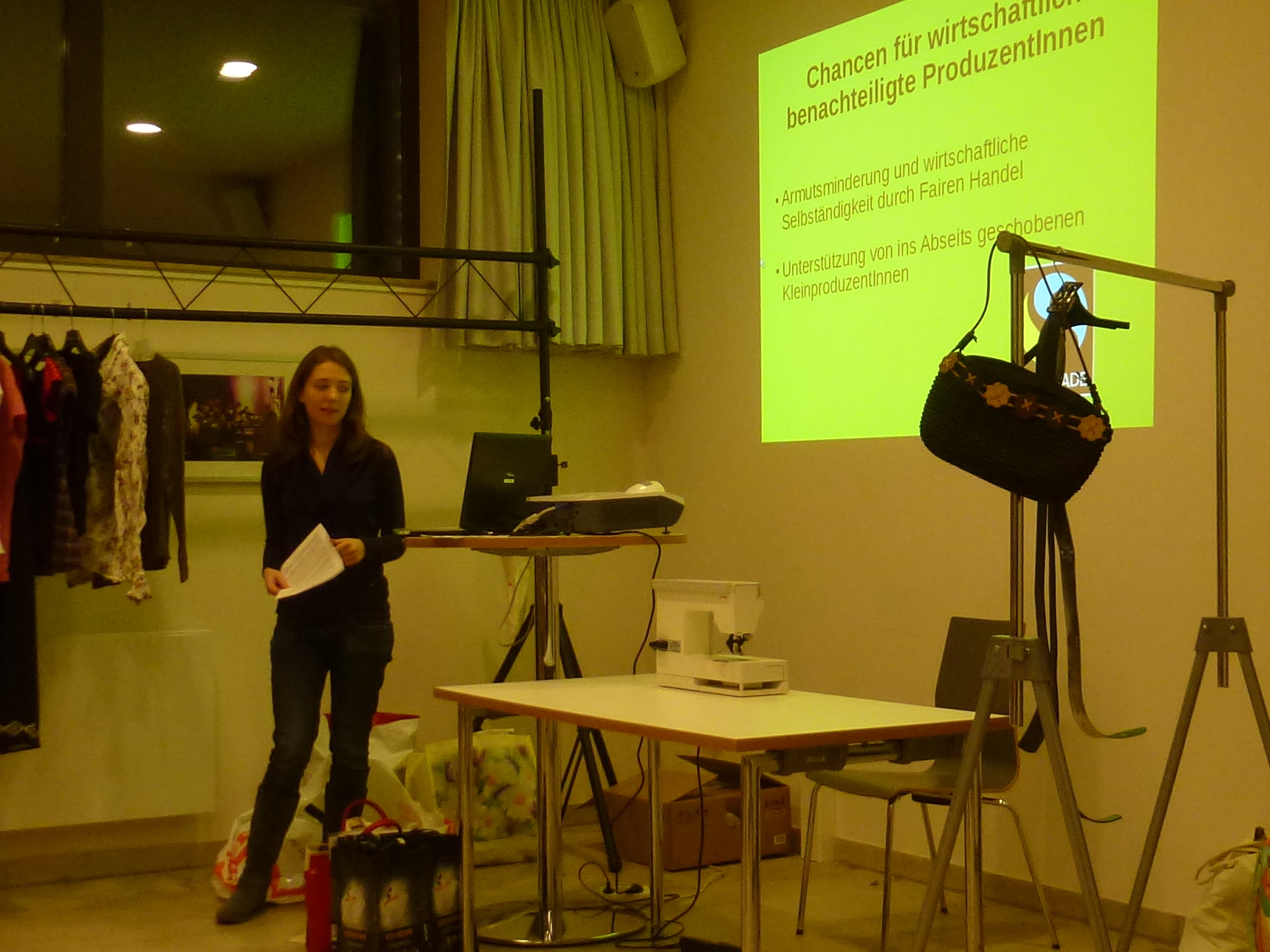 Jetzt vor Ostern tut ein Frühjahrsputz richtig gut. Dazu gehört auch, den Kleiderschrank zu entrümpeln und Luft zu schaffen. Bei der Kleidertauschparty war die Möglichkeit, überflüssige Kleidungsstücke los zu werden und selbst auch wieder etwas passendes zu finden. Wenn es nicht passte, dann wurde es von Mohammed aus der interkulturellen Änderungs- und Maßschneiderei passend gemacht. Am Anfang stellte Anna Möslein die Prinzipien des fairen Handels vor und ließ die TeilnehmerInnen zu verschiedenen Fragen einordnen. Bei einer Frage zum Beispiel sollten sich die TeilnehmerInnen einordnen, wie fair sie einen Stundenlohn von 8,50 Euro finden, wobei sich eine richtige Diskussion zwischen den verschiedenen Meinungen ergab. Auch die Frage, ob 48 Stunden Arbeitszeit in der Woche fair seinen wurde diskutiert, wobei das mehr TeilnehmerInnen als ungerecht empfanden. Für das Siegel von fairtrade sind 48 Stunden Arbeitszeit allerdings noch fair einzustufen, weil es in vielen Ländern deutlich mehr Wochenstunden sind.
