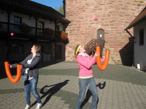 Nach einer kurzen Nacht in den alten Burggemäuern stand der Samstag Morgen unter dem Zeichen der Helden. 4 „Helden“ der Kolpingjugend hatten Workshops angeboten. Die Jugendlichen konnten Infos und Praxis zu den Themen Öffentlichkeitsarbeit, Zirkusspiele, sexuelle Prävention und Partyorganisation sammeln.