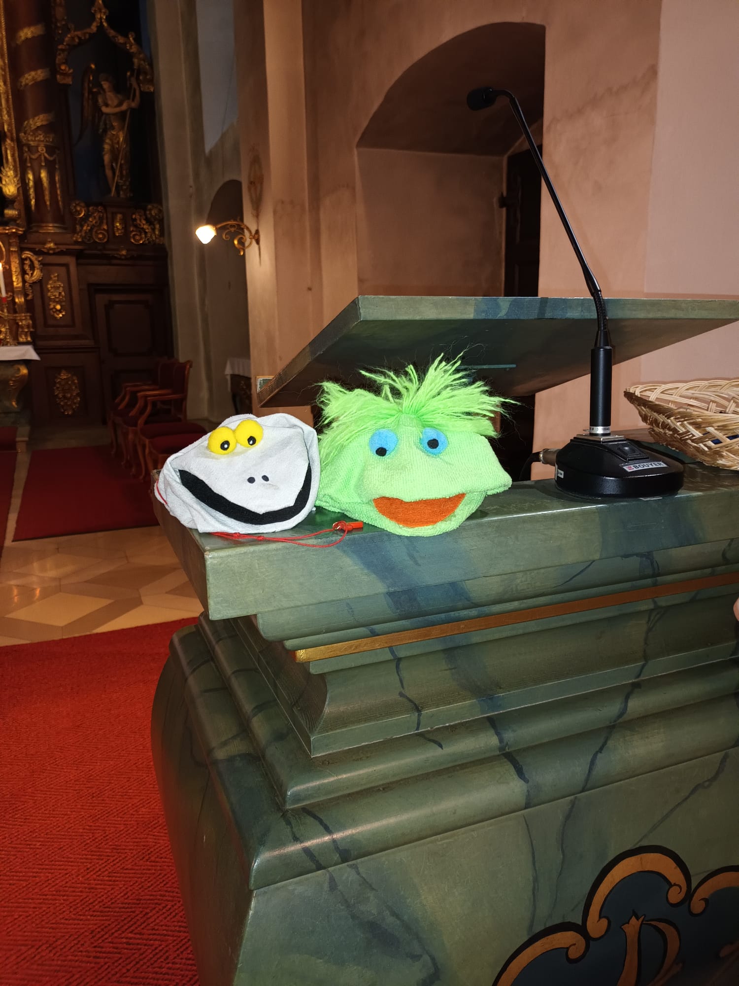 Begleitet wurden wir heuer auch von zwei interessanten Gesellen. Der Jammerlappen in Form einer grauen Handpuppe machte schon zu Beginn der Wallfahrt auf sich aufmerksam. Nämlich indem er seinem Namen alle Ehre machte und drauflos jammerte, was das Zeug hielt. Er wollte eigentlich gar nicht mitkommen, es wird sowieso langweilig, er ist jetzt schon müde usw. Als er aber ein schönes Wallfahrerkreuz bekam, freute er sich sogar ein bisschen und alle beschlossen, den Jammerlappen auf der Wallfahrt doch mitzunehmen.