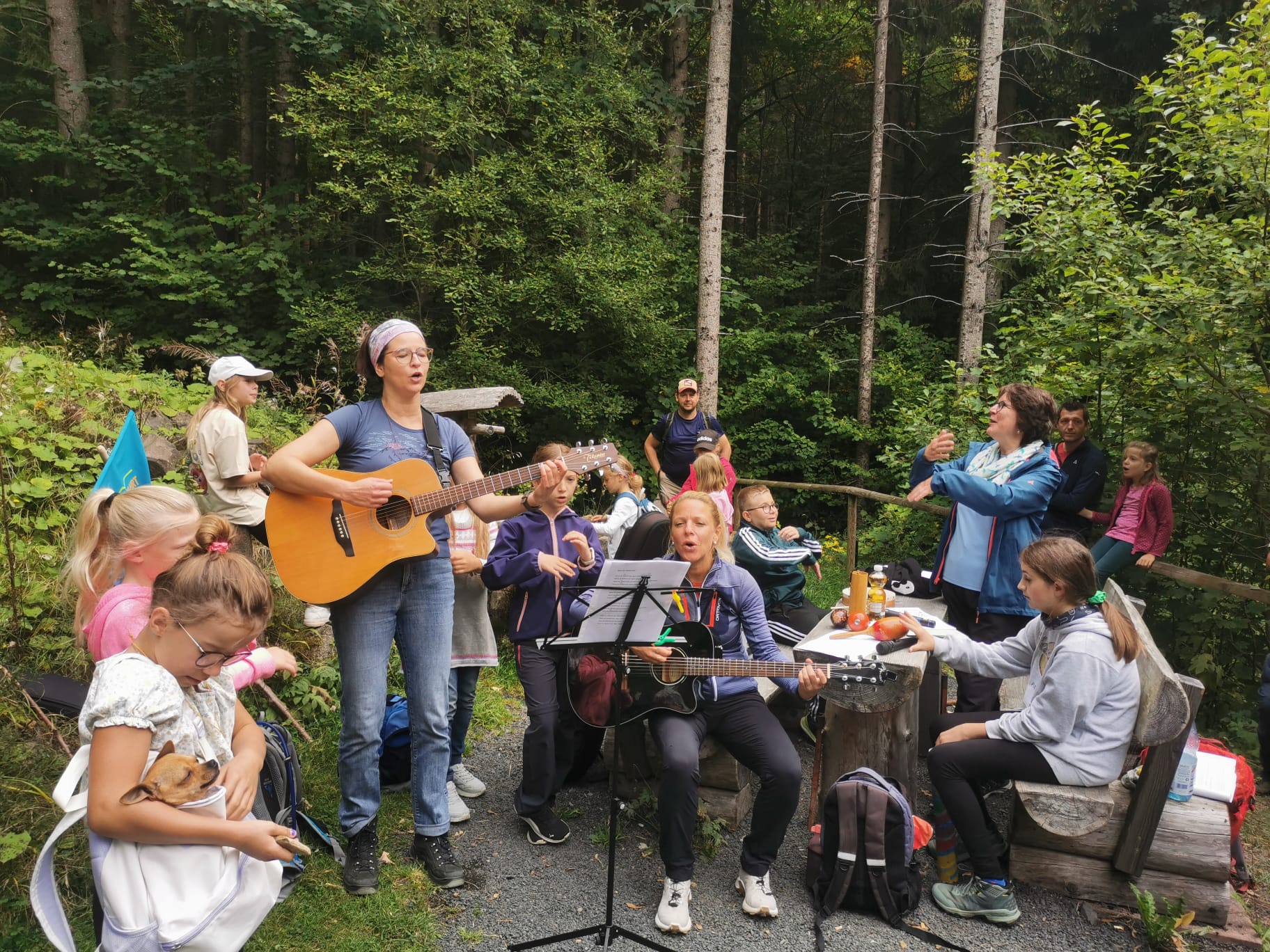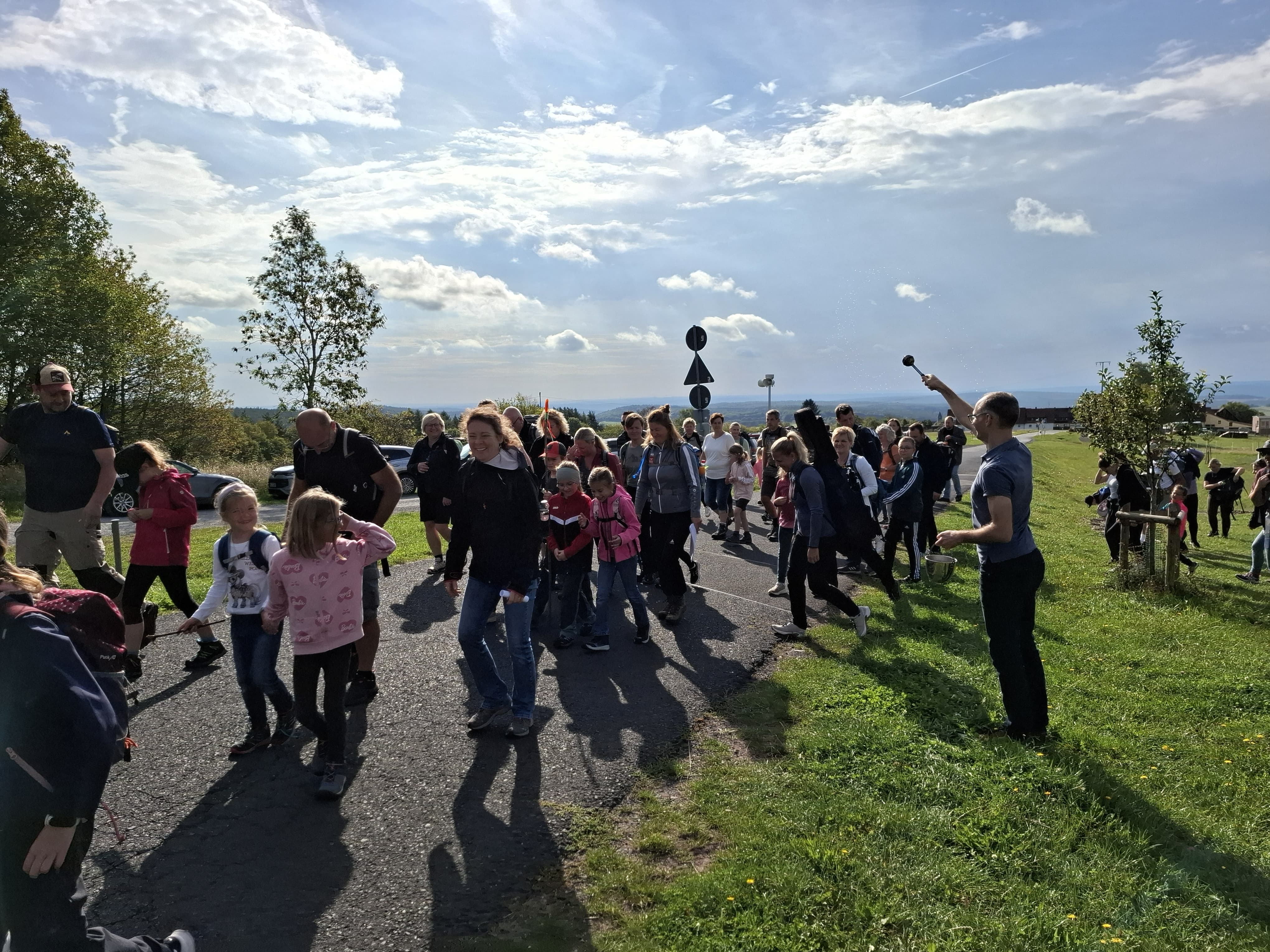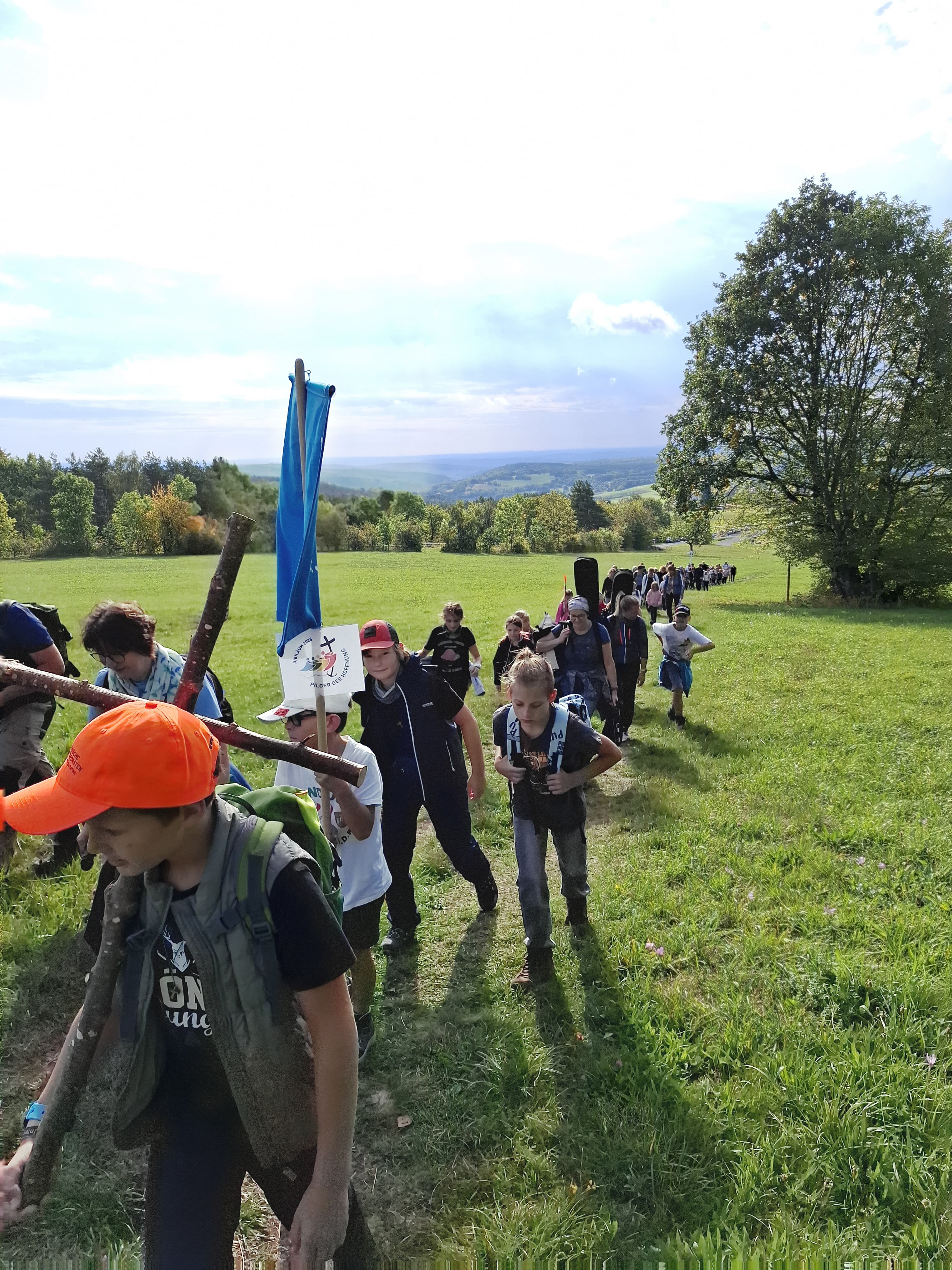 Mit Klanginstrumenten wurde dann die biblische Erzählung „Jesus und der Seesturm“ aus dem Markus-Evangelium den Teilnehmenden nahegebracht. Jesus fragt darin seine Freunde: „Warum habt ihr solche Angst? Habt ihr kein Vertrauen zu mir?“ Jesus möchte ihnen und uns zu verstehen geben, dass er auch in stürmischen Zeiten bei uns ist. Mit dem dazu passenden Lied „Wenn der Sturm tobt“ machten wir uns weiter auf den Weg Richtung Kreuzberg.