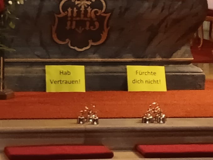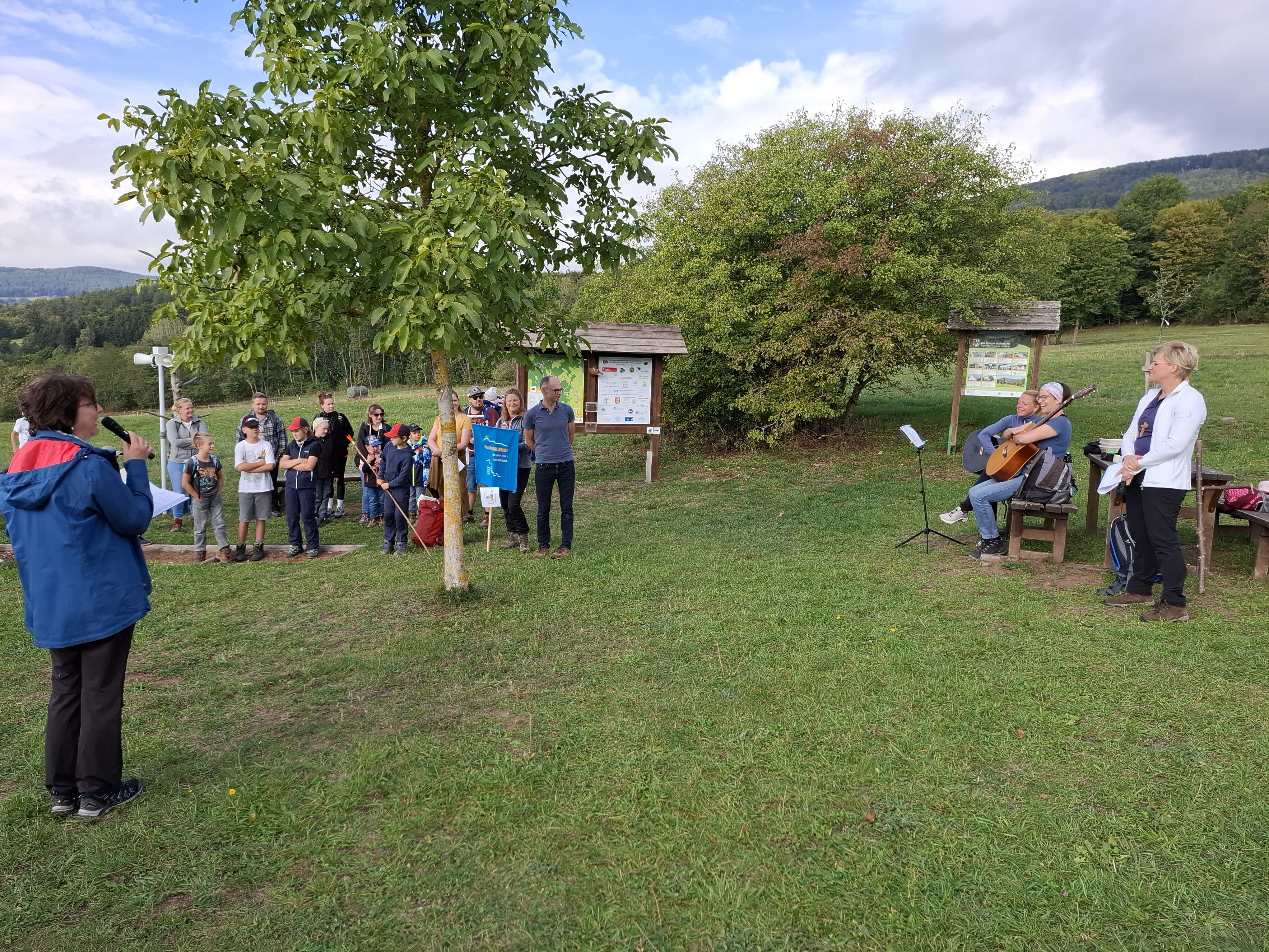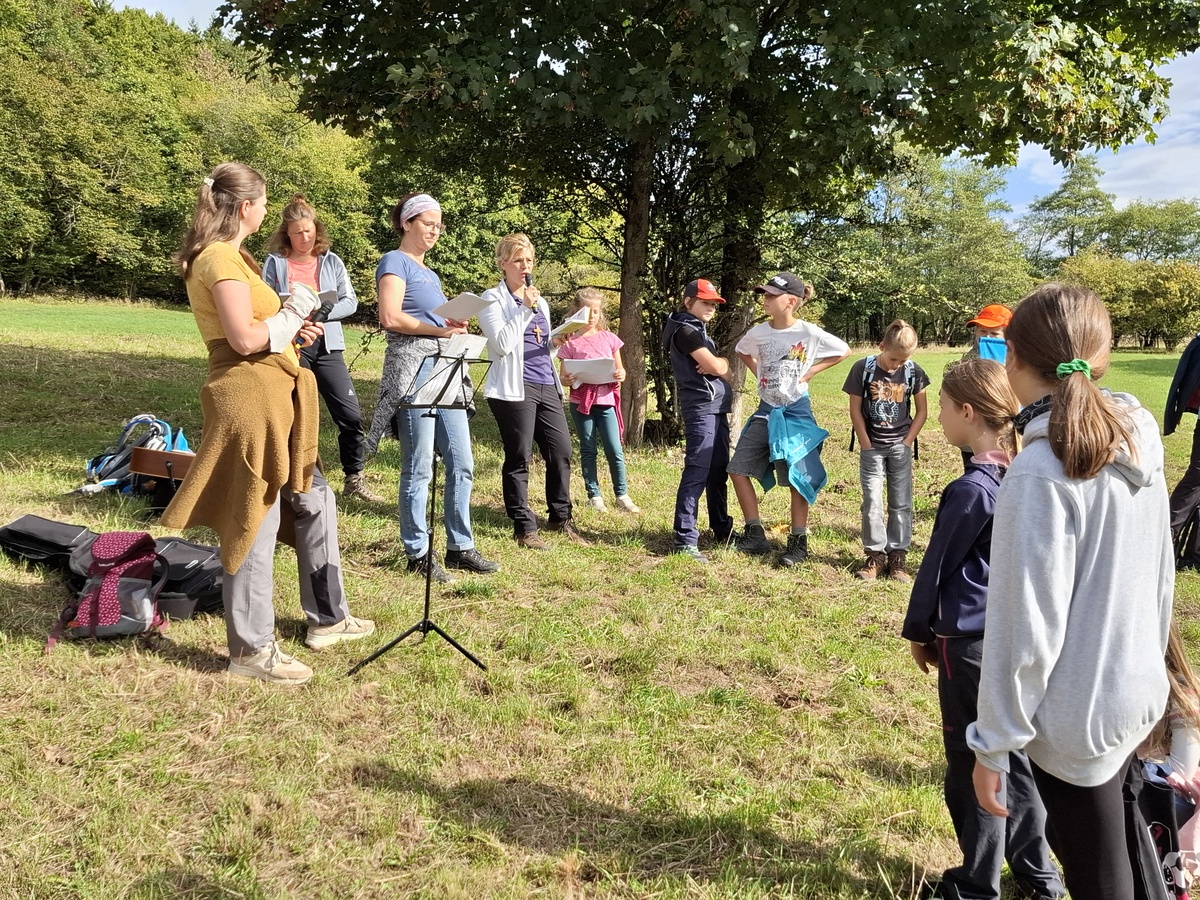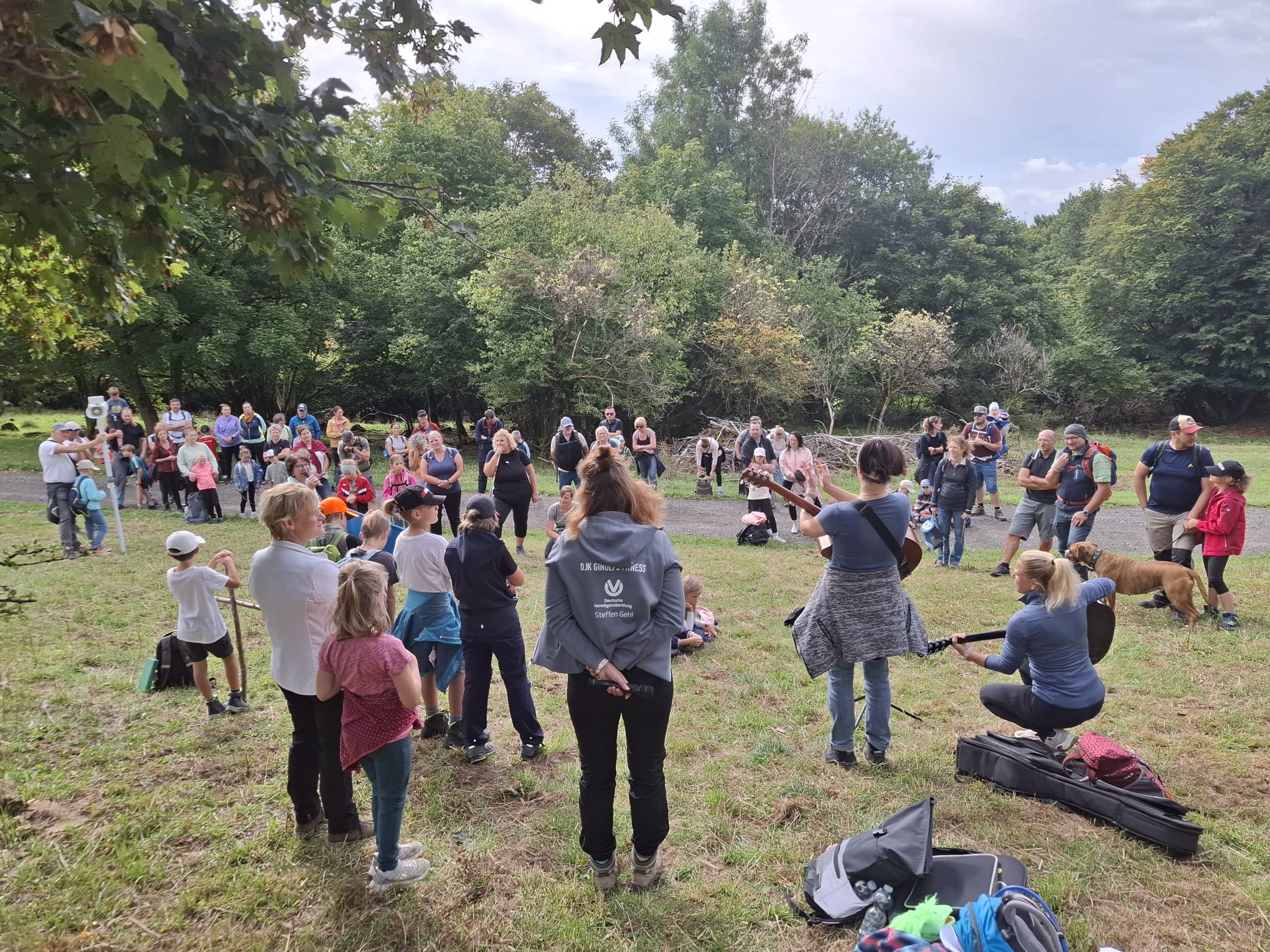 Mit Klanginstrumenten wurde dann die biblische Erzählung „Jesus und der Seesturm“ aus dem Markus-Evangelium den Teilnehmenden nahegebracht. Jesus fragt darin seine Freunde: „Warum habt ihr solche Angst? Habt ihr kein Vertrauen zu mir?“ Jesus möchte ihnen und uns zu verstehen geben, dass er auch in stürmischen Zeiten bei uns ist. Mit dem dazu passenden Lied „Wenn der Sturm tobt“ machten wir uns weiter auf den Weg Richtung Kreuzberg.