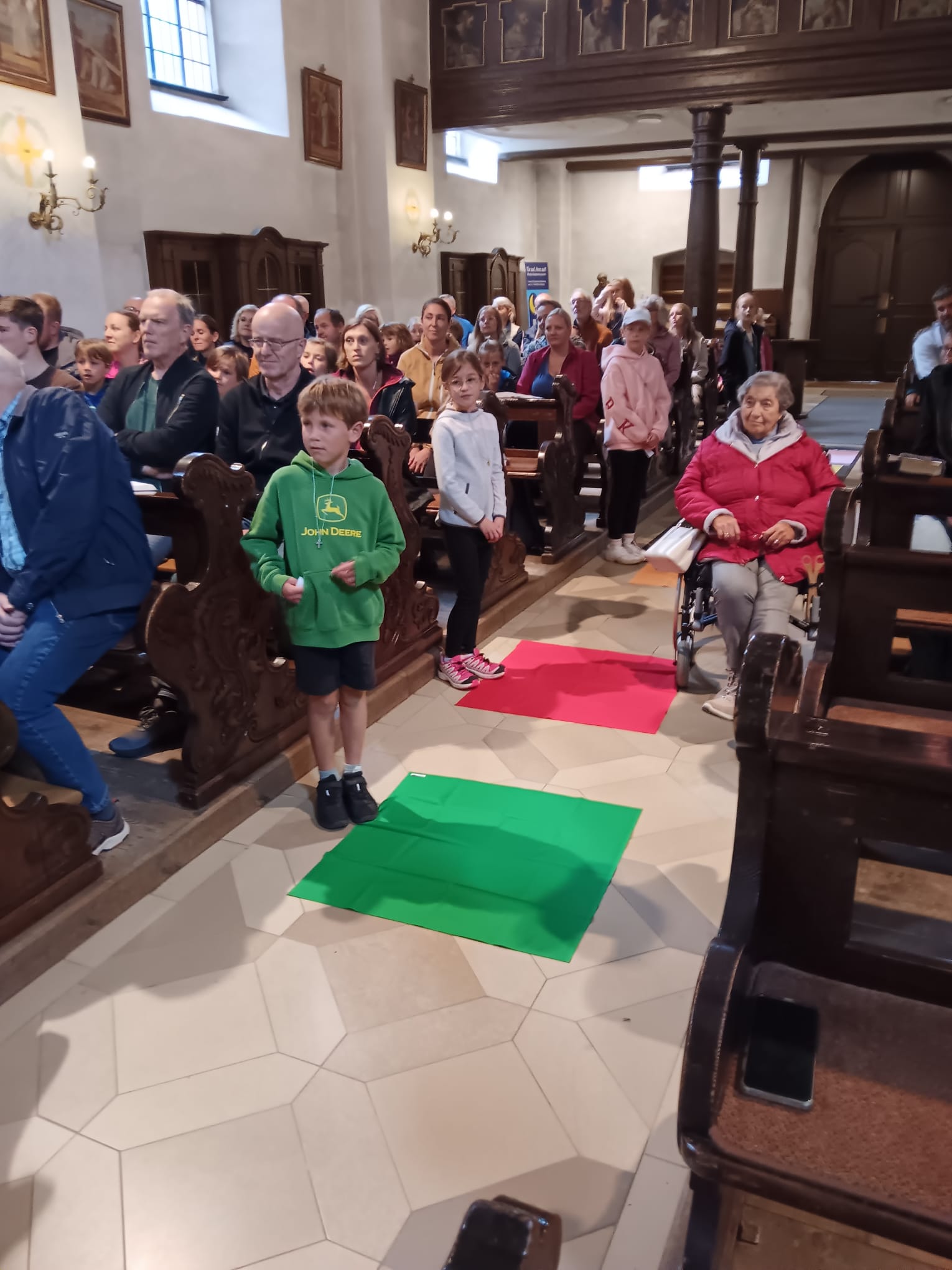 Vor dem Wortgottesdienst durften die Kinder dann zunächst einmal einen großen Schatz entdecken. In einer feierlichen Prozession wurde die Bibel durch den Gang nach vorne getragen, geschmückt mit bunten Tüchern und Hoffnungssätzen wie z.B.: Hoffnung heißt Helfen, denn so zeige ich jemand anderem, dass er oder sie nicht allein ist.