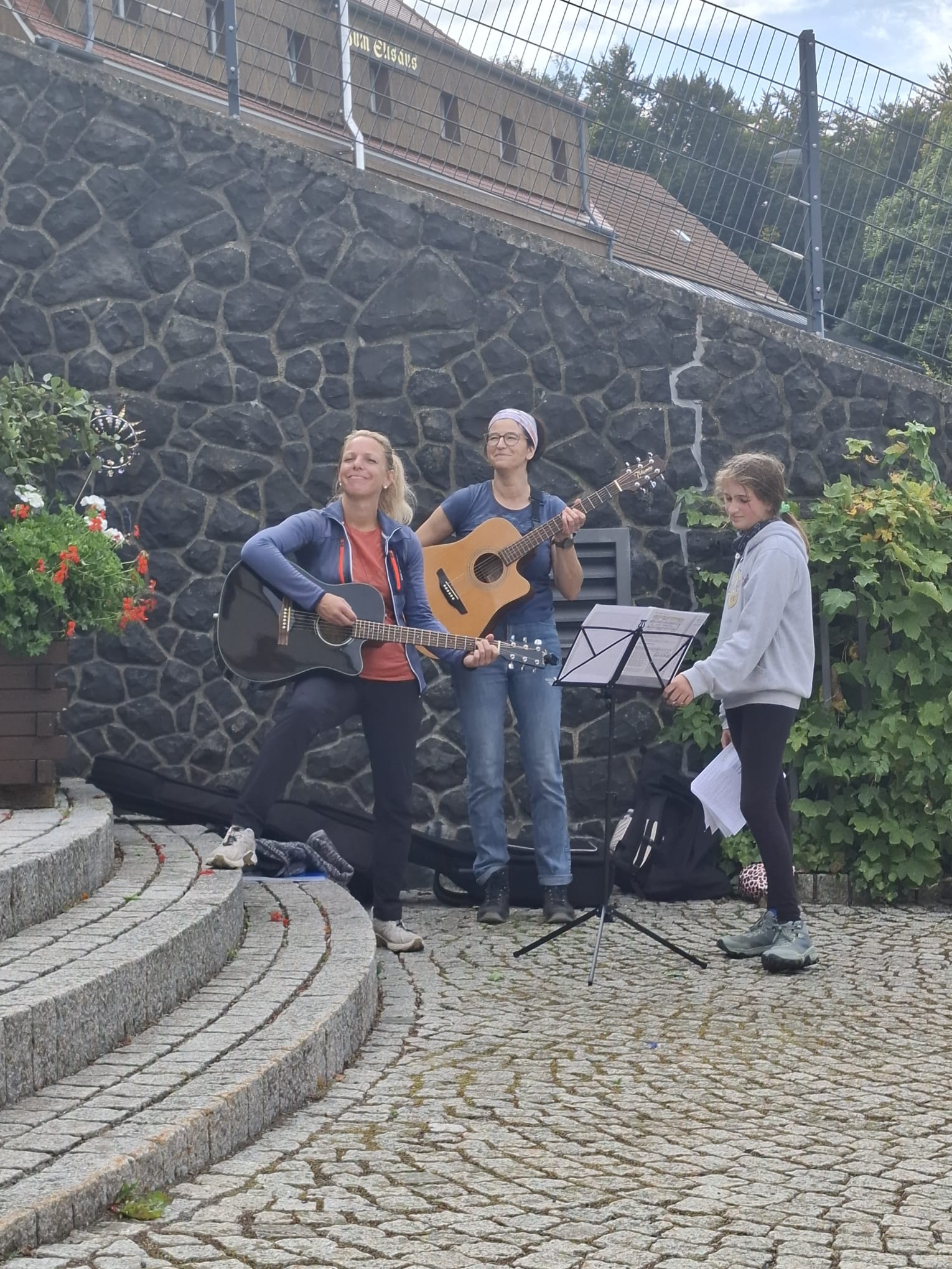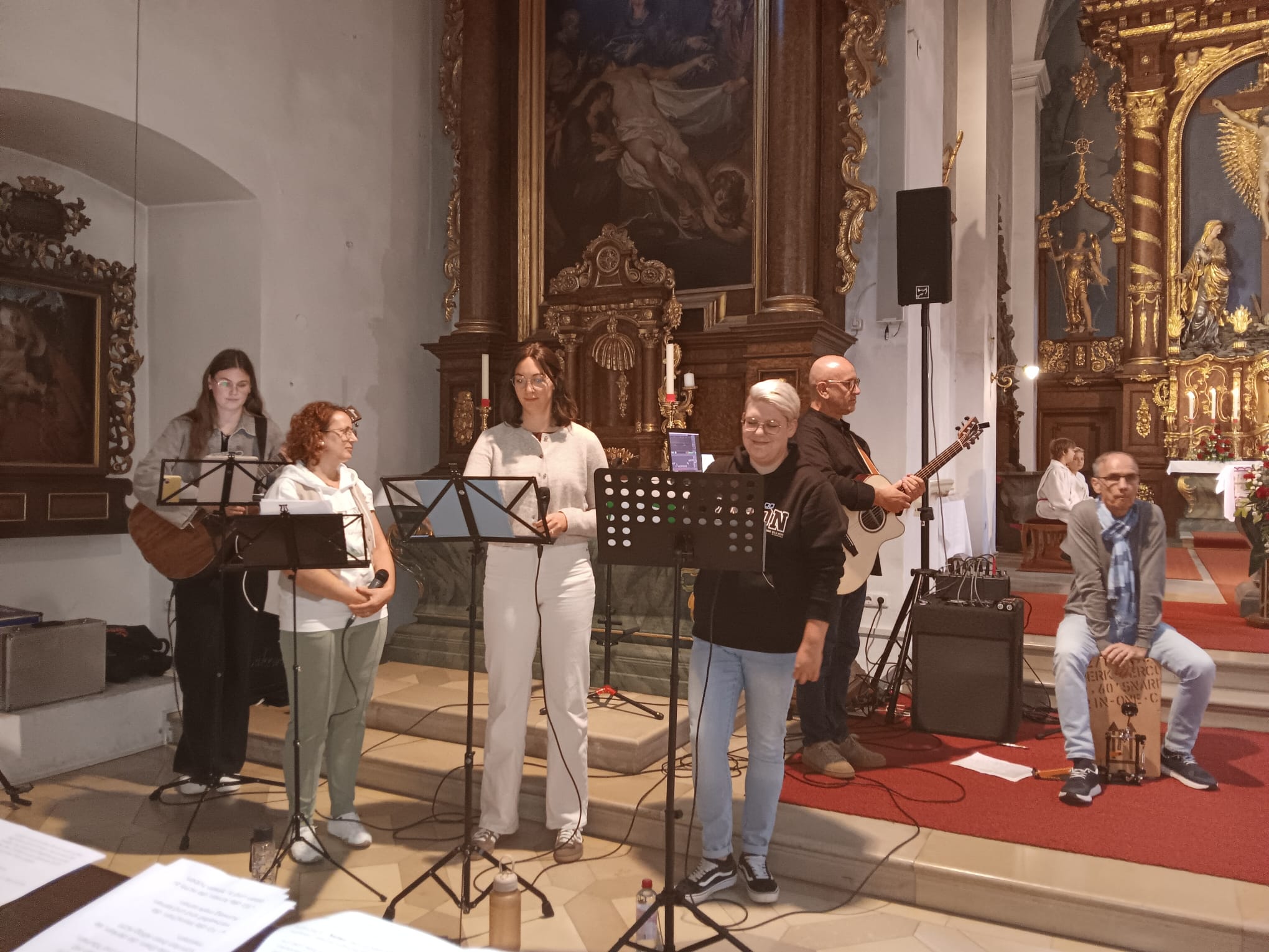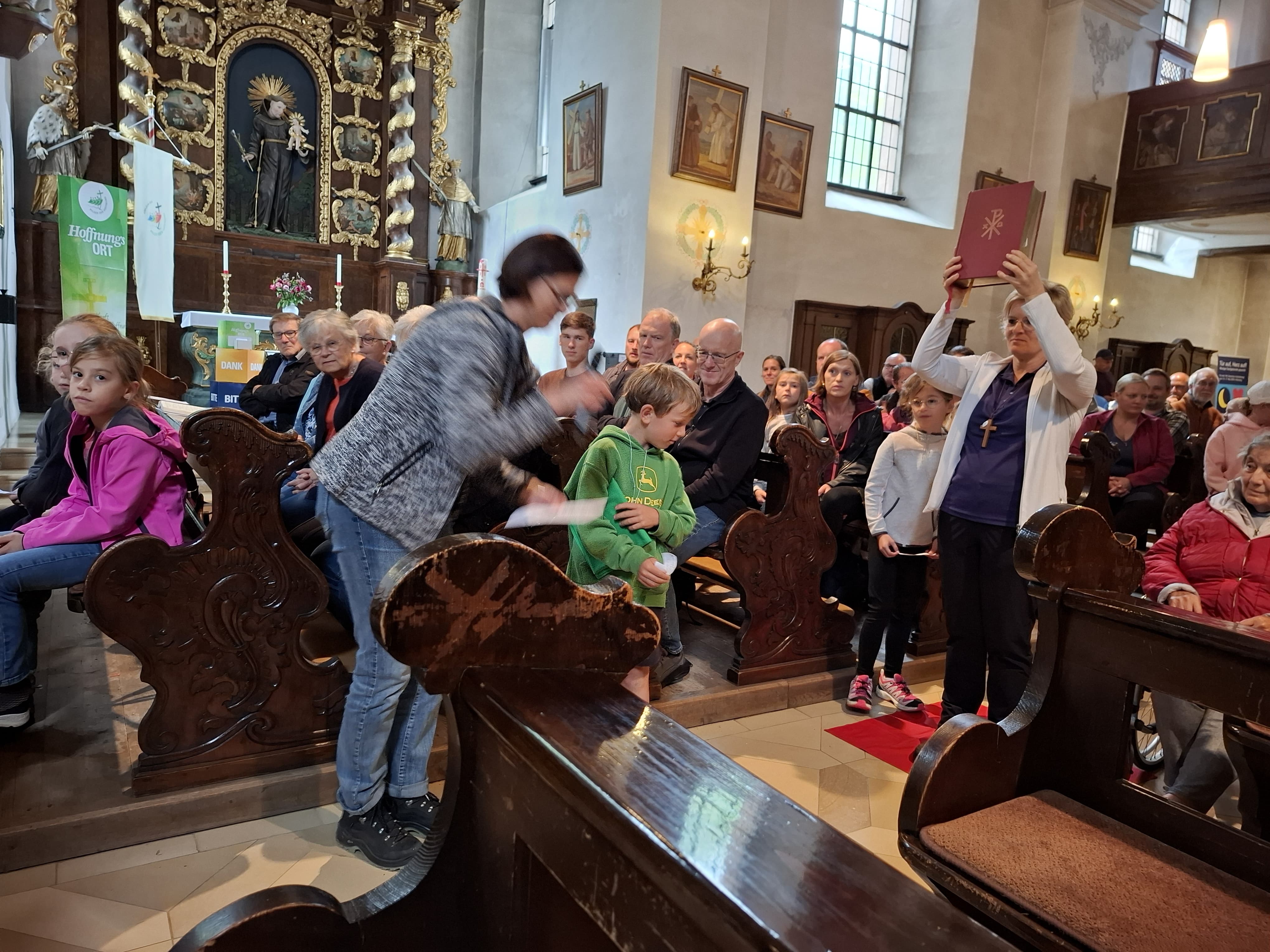 Nach der verdienten Mittagspause versammelten sich alle um 15 Uhr zum Gottesdienst in der Kirche. Dort wartete bereits Bruder Korbinian und die Walddörfer-Band auf uns, die den Gottesdienst musikalisch sehr bereicherte mit ihrem schwungvollen Sound und dem vielstimmigen Gesang. Herzlichen Dank!