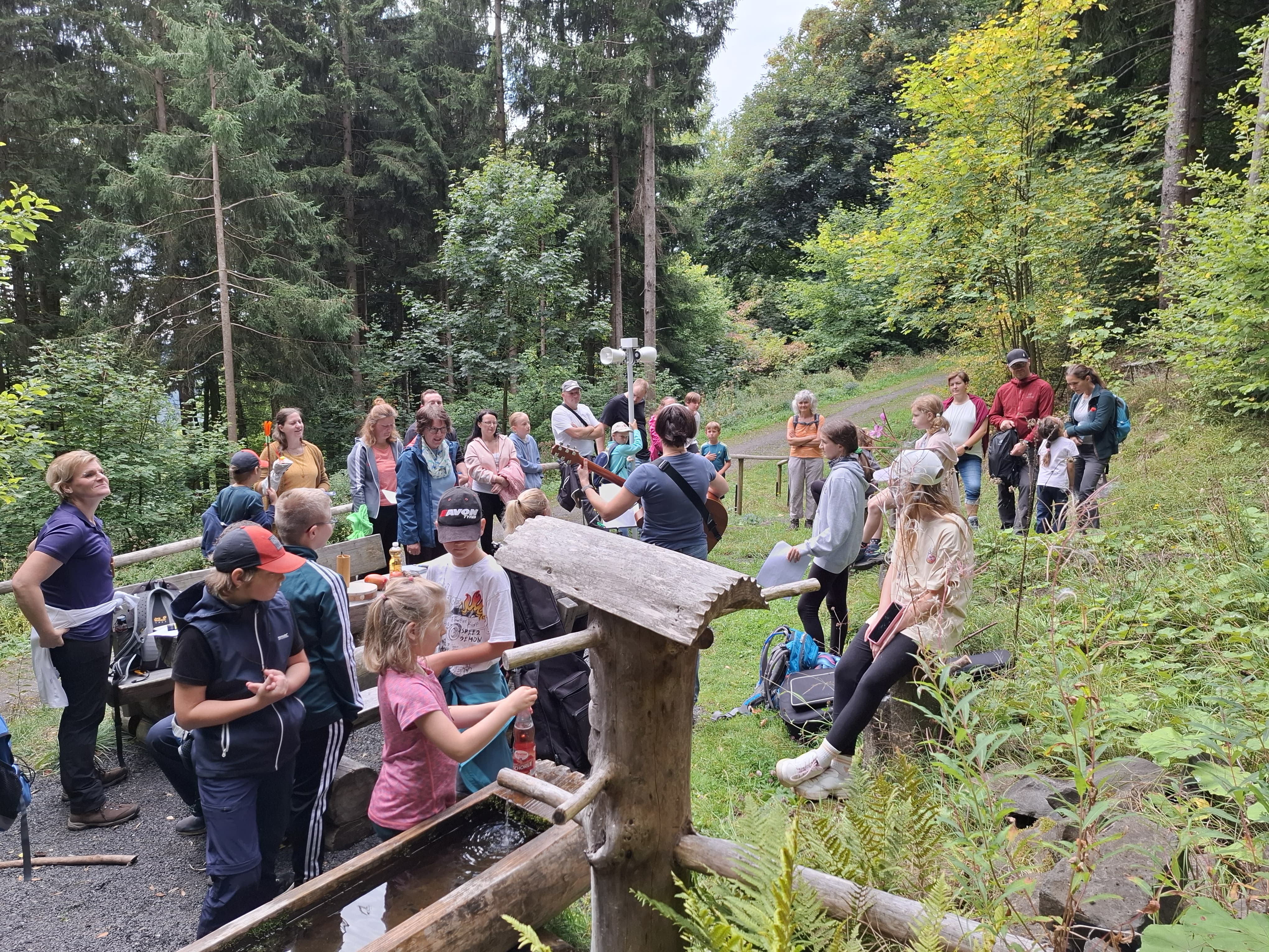 Durch den Weißdorntunnel ging es abenteuerlich weiter. An der nächsten Station „beim Jostenbrunnen“ durften sich alle erst einmal stärken. Die Kinder zeigten dann alle ihre „Schätze“, die sie in der Natur gefunden hatten: wundervolle Blätter, Tannenzapfen und vieles mehr. Ein Erwachsener antwortete auf die Frage, was ihm Hoffnung schenkt mit einem Wort: die Liebe. Dazu braucht es wohl keiner weiteren Erklärung.