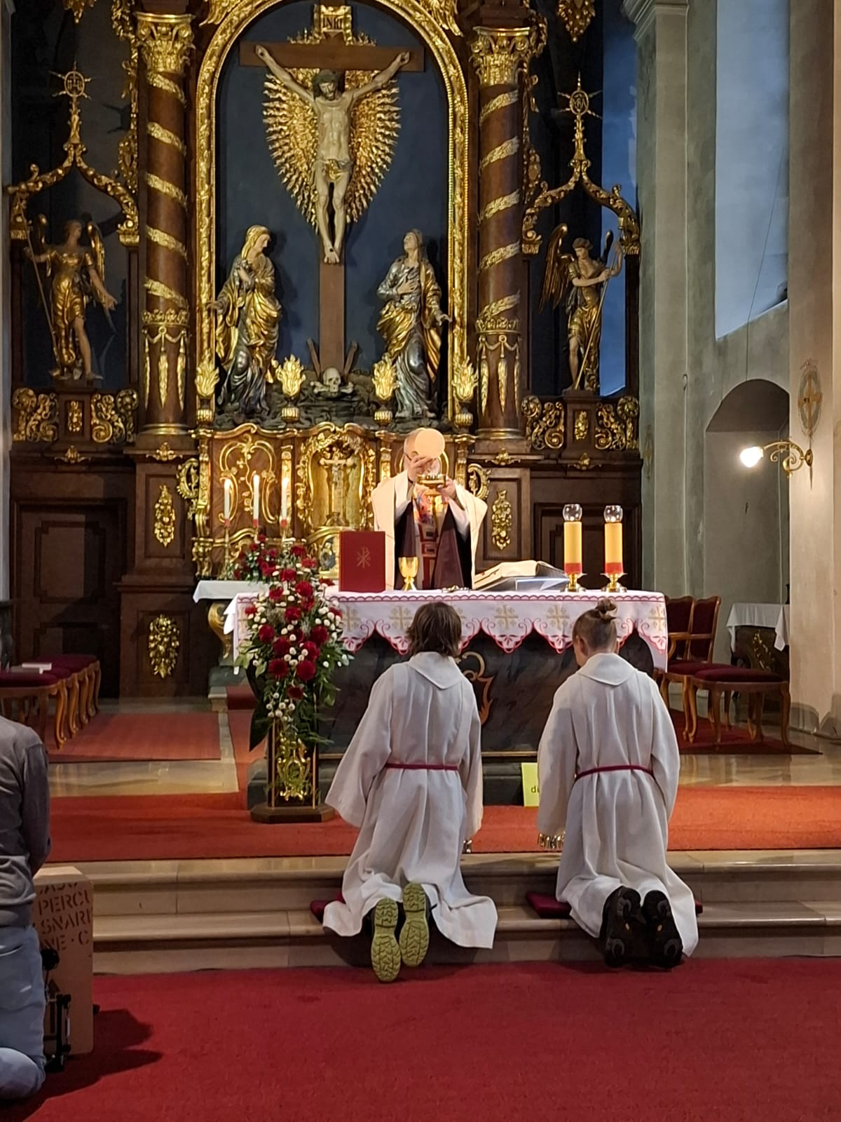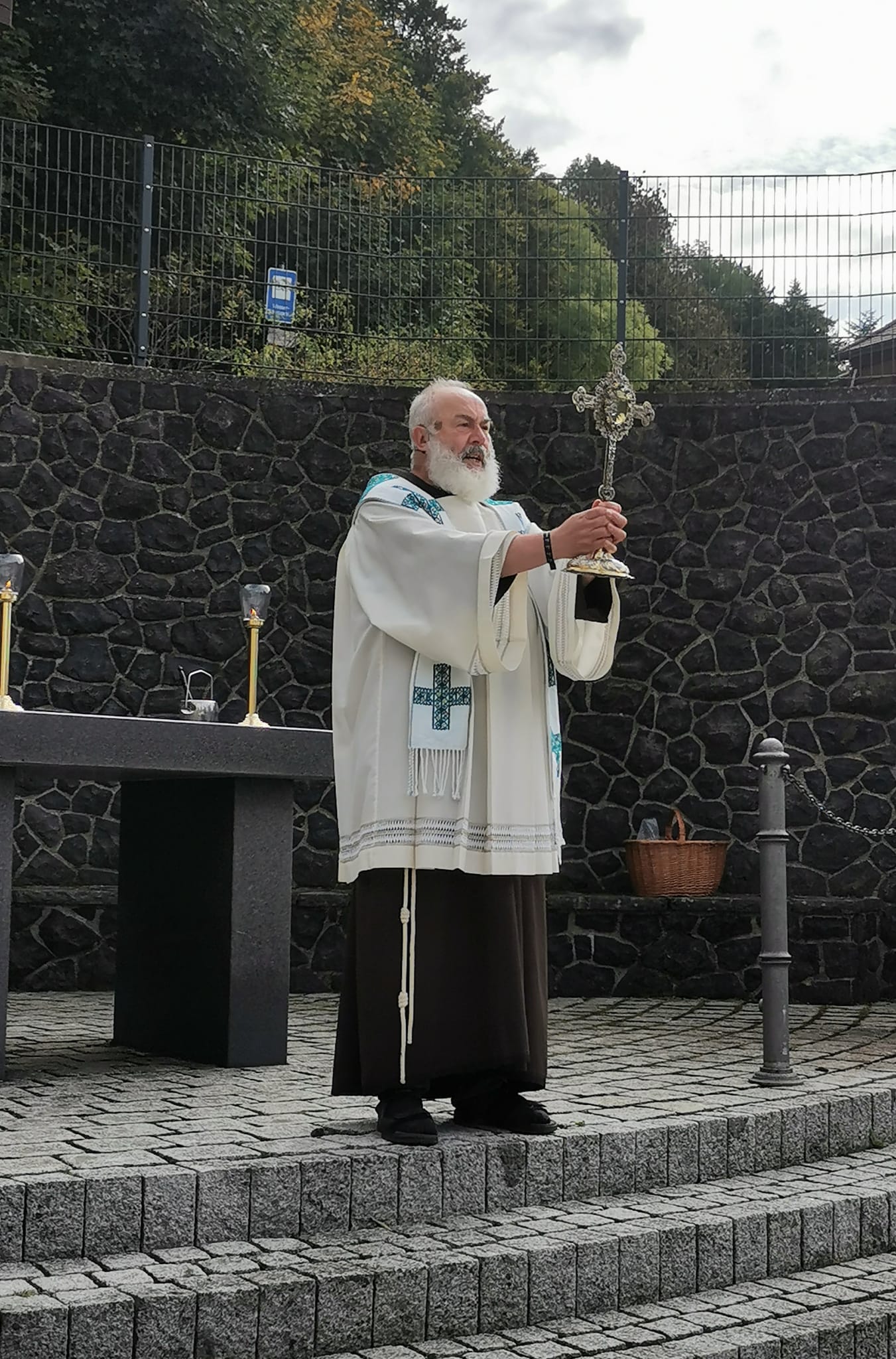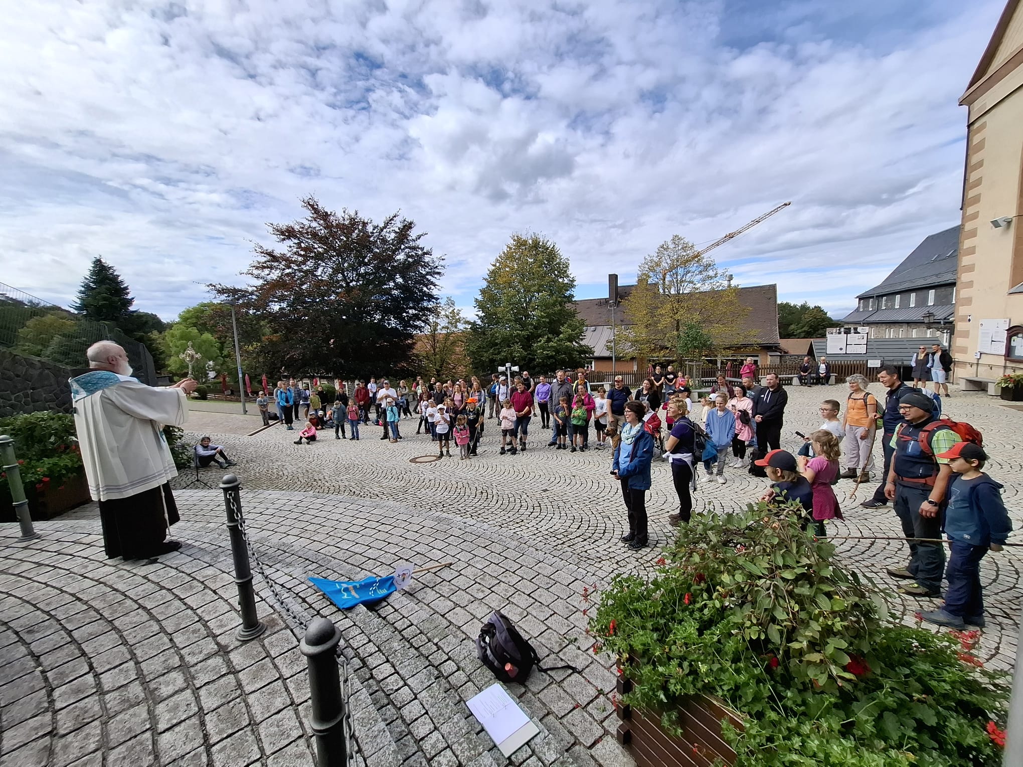 Das letzte Stück gingen wir gemeinsam betend und singend, bevor wir am Kreuzberg von Bruder Korbinian wieder mit viel Weihwasser traditionell als Wallfahrtsgruppe begrüßt wurden und er uns am Freialtar den besonderen Wallfahrtssegen spendete. Alle waren sichtlich glücklich, gut angekommen zu sein, vor allem auch trocken, nachdem die Wetterprognose nicht so gut war.