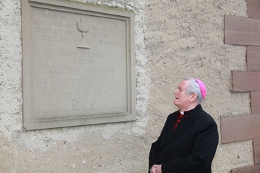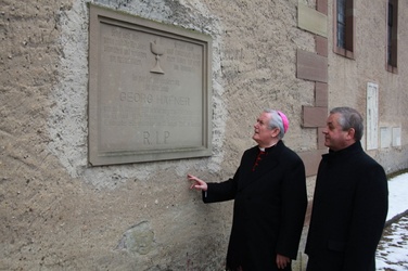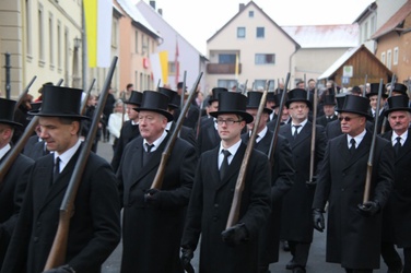 Begrüßung vor dem Festgottesdienst in Oberschwarzach im Landkreis Schweinfurt: Bürgerwehr-Hauptmann Georg Wagner (links) begrüßt Bischof Dr. Friedhelm Hofmann und die Ehrengäste.