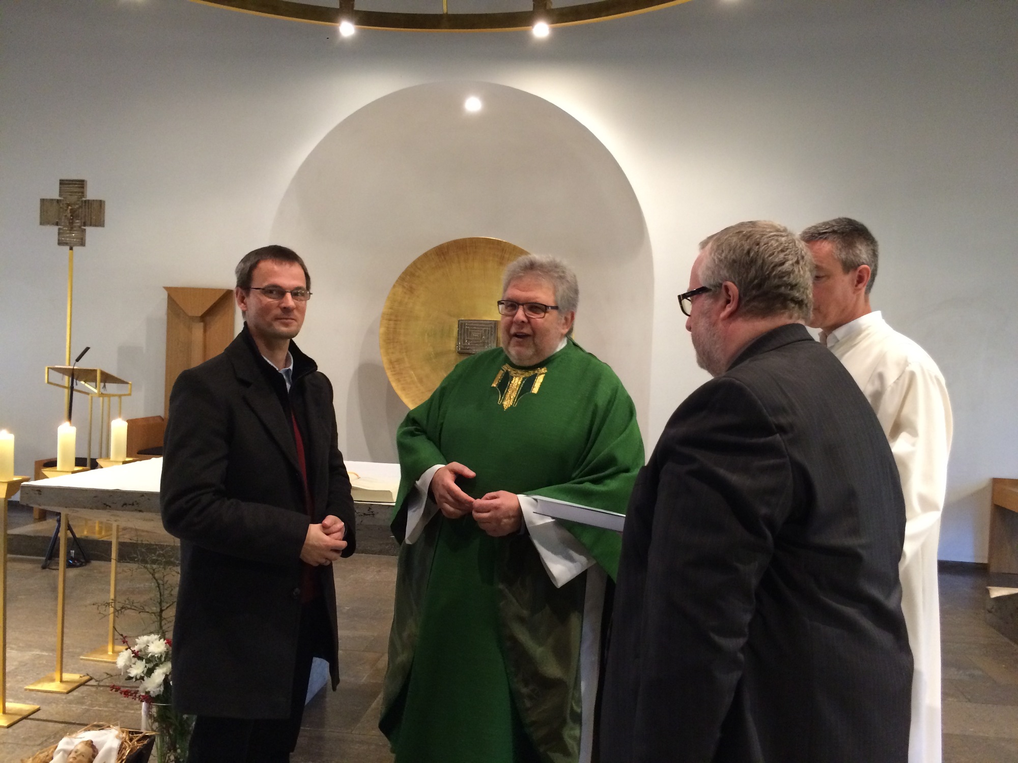 Dirk Rudolph, Gesamtsprecher der Berufsgruppe der Pastoralreferenten im Bistum Würzburg, freute sich, der Flüchtlingshilfe der Caritas die Kollekte des Gottesdienstes in Höhe von 826 Euro überweisen zu können.