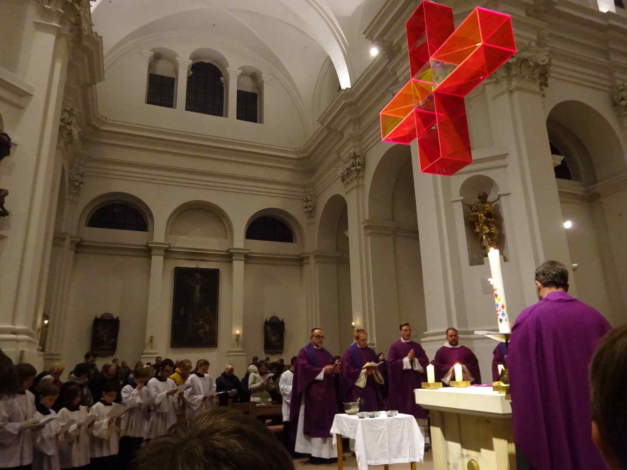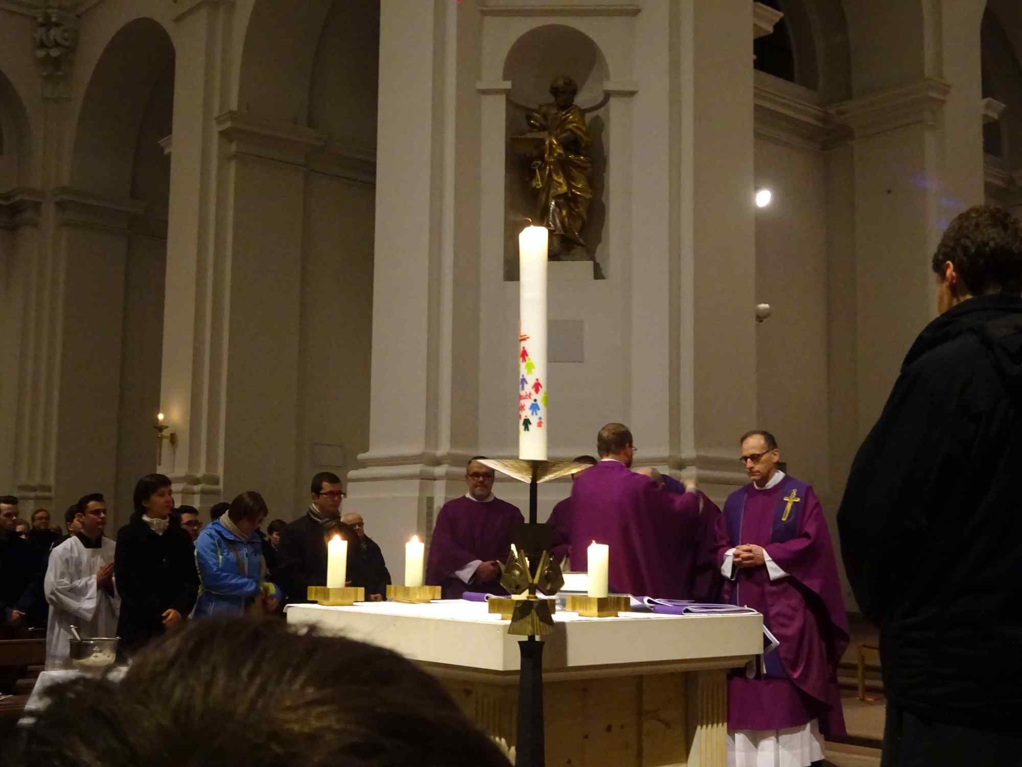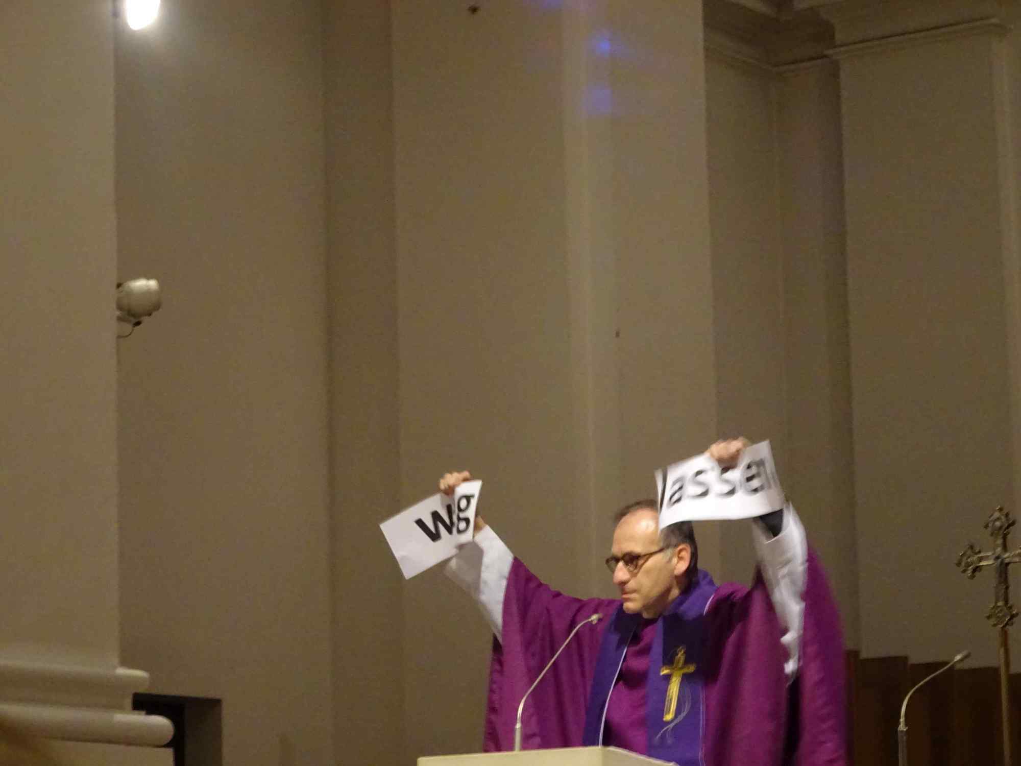 Die Würzburger Katholikentage sind eröffnet! Bis auf den letzten Platz besetzt war die Pfarrkirche Stift Haug am Aschermittwoch, 10. Februar 2016, als Dekan Dr. Jürgen Vorndran die 10 Missionare und Missionrinnen der Hünfelder Oblaten aussandte, die 12 Tage lang in Würzburg den Glauben ins Gespräch bringen wollen. Das Programm umfasst u. a. Gottesdienste, Angebote für Männer, Frauen und Kinder, Besuche in Schulen und Kindergärten. Eingeladen sind alle, nicht nur Katholiken. Pater Martin Wolf überraschte die Gottesdienstbesucher nicht minder, als er in seiner Predigt eine überdimensional große Schere zur Hand nahm, und das Banner mit der Aufschrift "Weglassen" zerschnitt. Aus dem die Fastenzeit inspirierenden "weglassen" wurde so ein "Weg lassen". Wenn wir lieb gewordene Dinge wie Alkohol, Fernsehen oder gar das Smart phone weglassen, lassen wir Gott einen Weg. Dazu möchten die 40 Tage der österlichen Bußzeit ermutigen, so Pater Martin. Zwei Vertreter der Fuldaer Pfarreien St. Peter und St. Paul, in denen zuletzt die Glaubenstage stattgefunden haben, übergaben Dompfarrer Vorndran eine große Kerze, die die nächsten 12 Tage in Würzburg brennen wird. Die Katholikentage sind "angepfiffen", lassen wir den Glauben ins Spiel kommen, um die Menschen mit Gott zu überraschen. Eine Begegnung im Matthias-Ehrenfried-Haus und ein Nachgebet in Stift Haug rundeten den Abend ab.