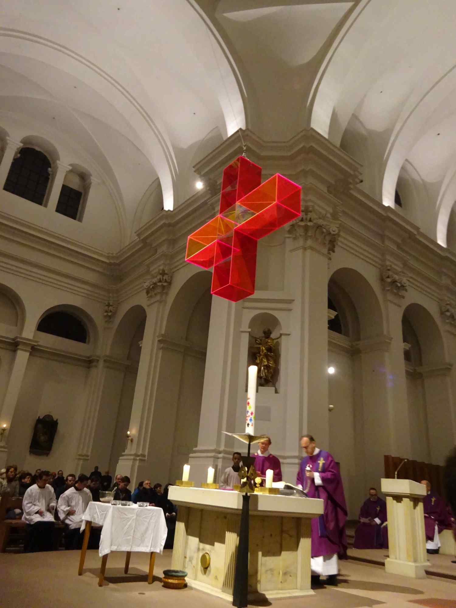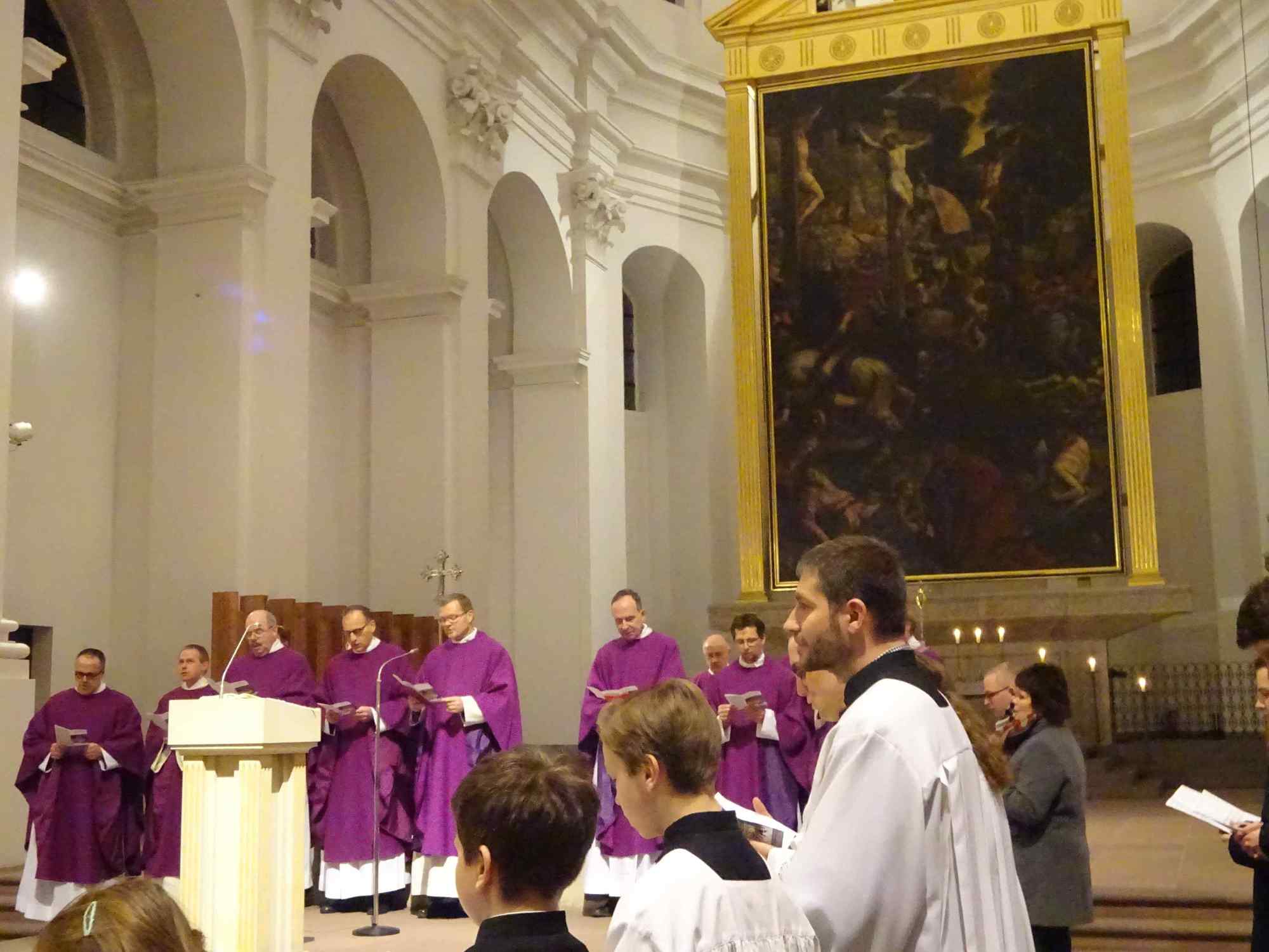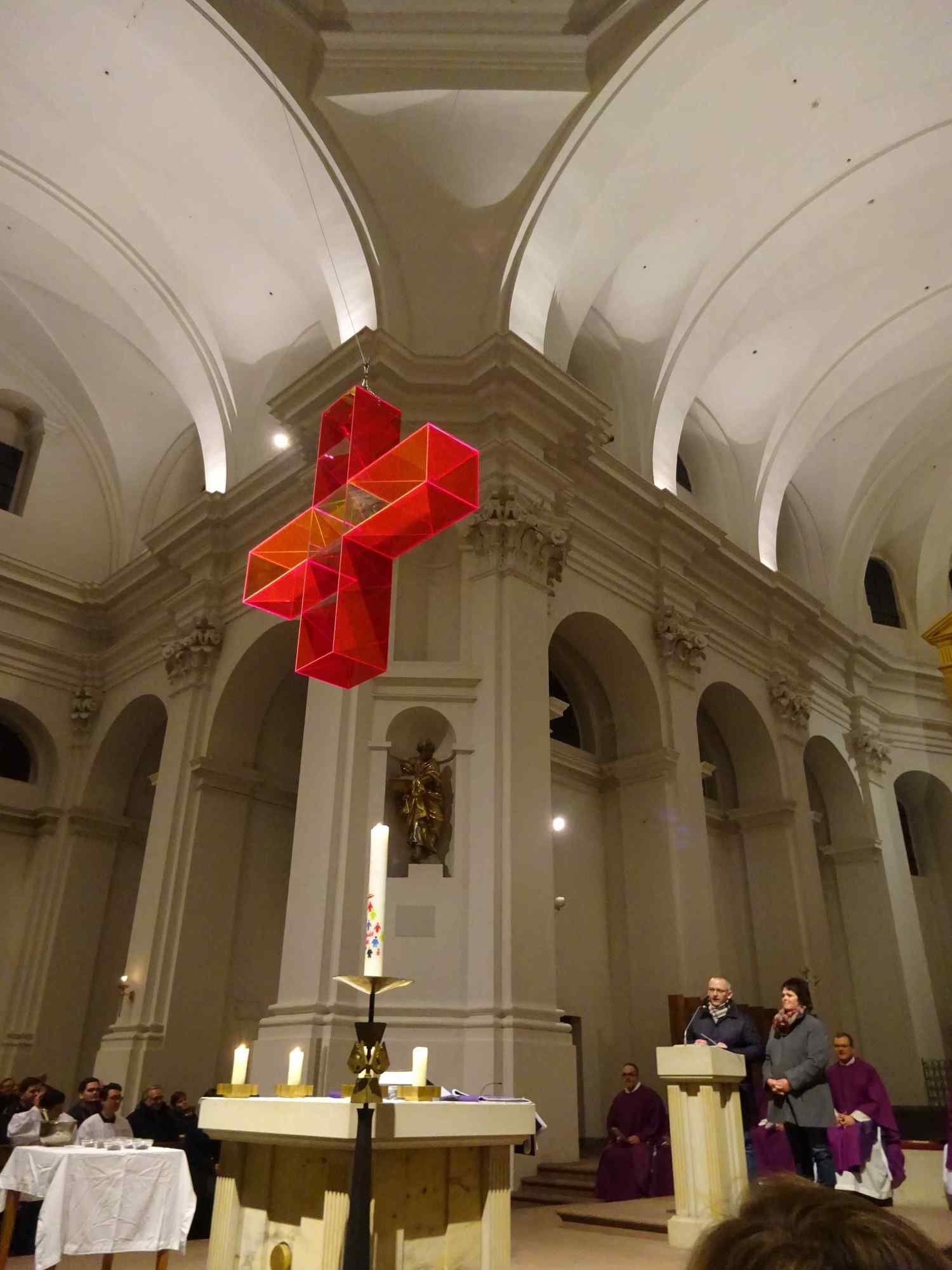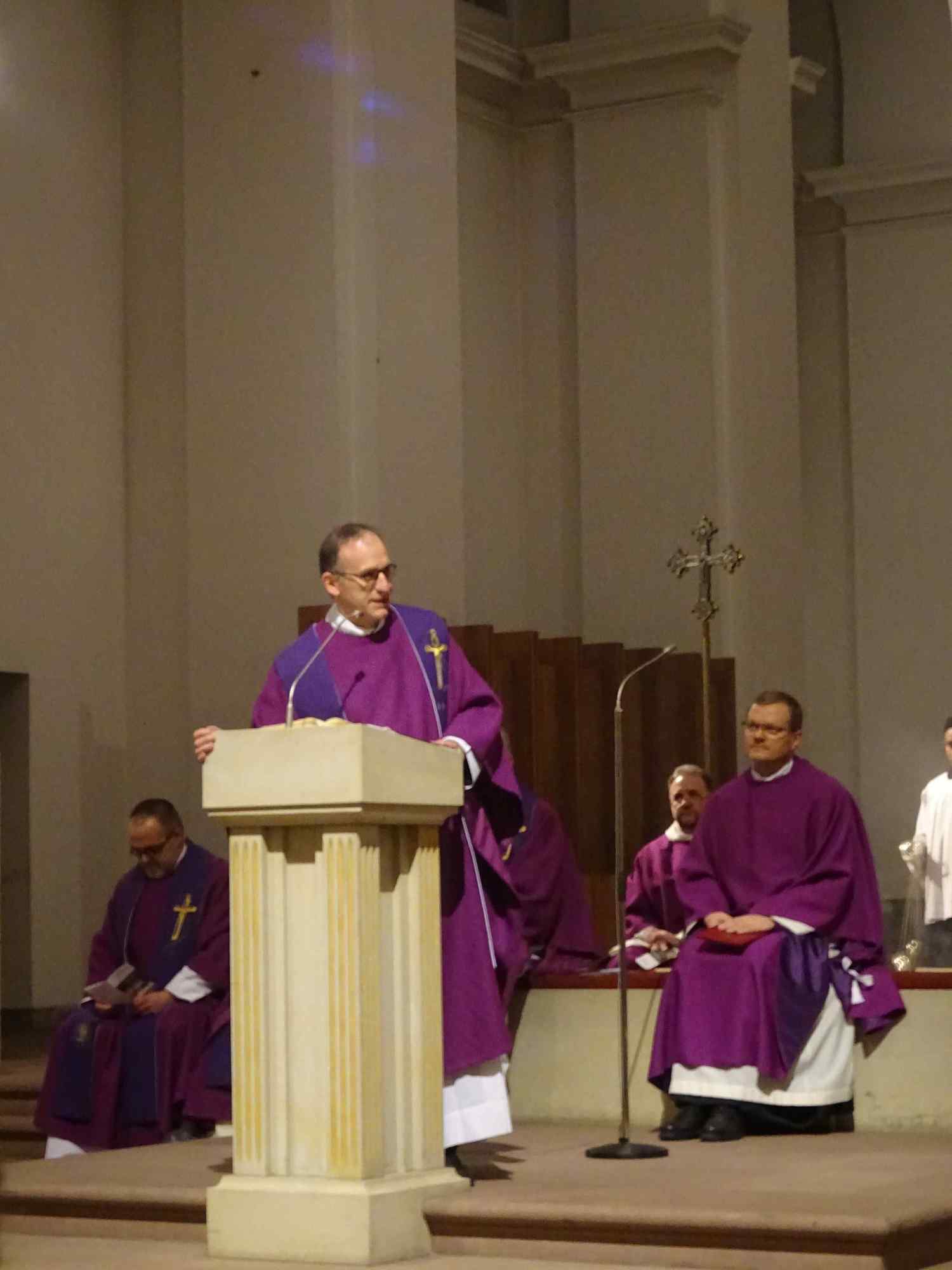 Die Würzburger Katholikentage sind eröffnet! Bis auf den letzten Platz besetzt war die Pfarrkirche Stift Haug am Aschermittwoch, 10. Februar 2016, als Dekan Dr. Jürgen Vorndran die 10 Missionare und Missionrinnen der Hünfelder Oblaten aussandte, die 12 Tage lang in Würzburg den Glauben ins Gespräch bringen wollen. Das Programm umfasst u. a. Gottesdienste, Angebote für Männer, Frauen und Kinder, Besuche in Schulen und Kindergärten. Eingeladen sind alle, nicht nur Katholiken. Pater Martin Wolf überraschte die Gottesdienstbesucher nicht minder, als er in seiner Predigt eine überdimensional große Schere zur Hand nahm, und das Banner mit der Aufschrift "Weglassen" zerschnitt. Aus dem die Fastenzeit inspirierenden "weglassen" wurde so ein "Weg lassen". Wenn wir lieb gewordene Dinge wie Alkohol, Fernsehen oder gar das Smart phone weglassen, lassen wir Gott einen Weg. Dazu möchten die 40 Tage der österlichen Bußzeit ermutigen, so Pater Martin. Zwei Vertreter der Fuldaer Pfarreien St. Peter und St. Paul, in denen zuletzt die Glaubenstage stattgefunden haben, übergaben Dompfarrer Vorndran eine große Kerze, die die nächsten 12 Tage in Würzburg brennen wird. Die Katholikentage sind "angepfiffen", lassen wir den Glauben ins Spiel kommen, um die Menschen mit Gott zu überraschen. Eine Begegnung im Matthias-Ehrenfried-Haus und ein Nachgebet in Stift Haug rundeten den Abend ab.