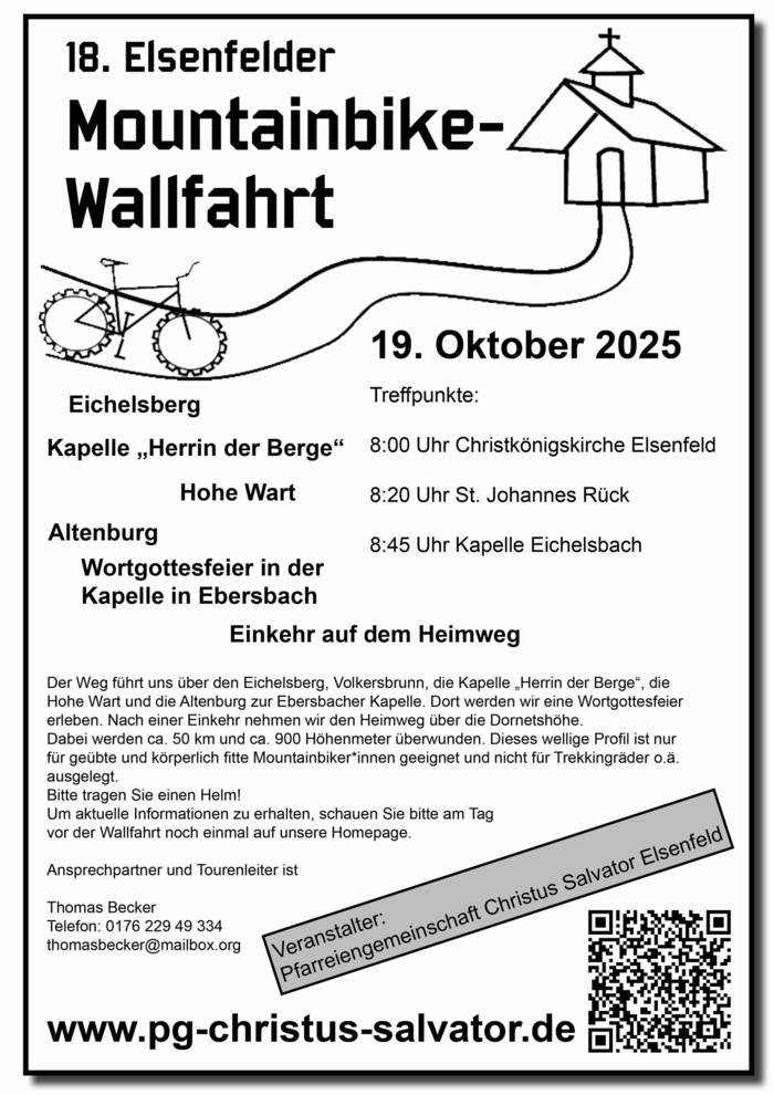 Der Weg führt uns über den Eichelsberg, Volkersbrunn, die Kapelle „Herrin der Berge“, die Hohe Wart und die Altenburg zur Ebersbacher Kapelle. Dort werden wir eine Wortgottesfeier erleben. Nach einer Einkehr nehmen wir den Heimweg über die Dornetshöhe. Dabei werden ca. 50 km und ca. 900 Höhenmeter überwunden. Dieses wellige Profil ist nur für geübte und körperlich fitte Mountainbiker*innen geeignet und nicht für Trekkingräder o.ä. ausgelegt.