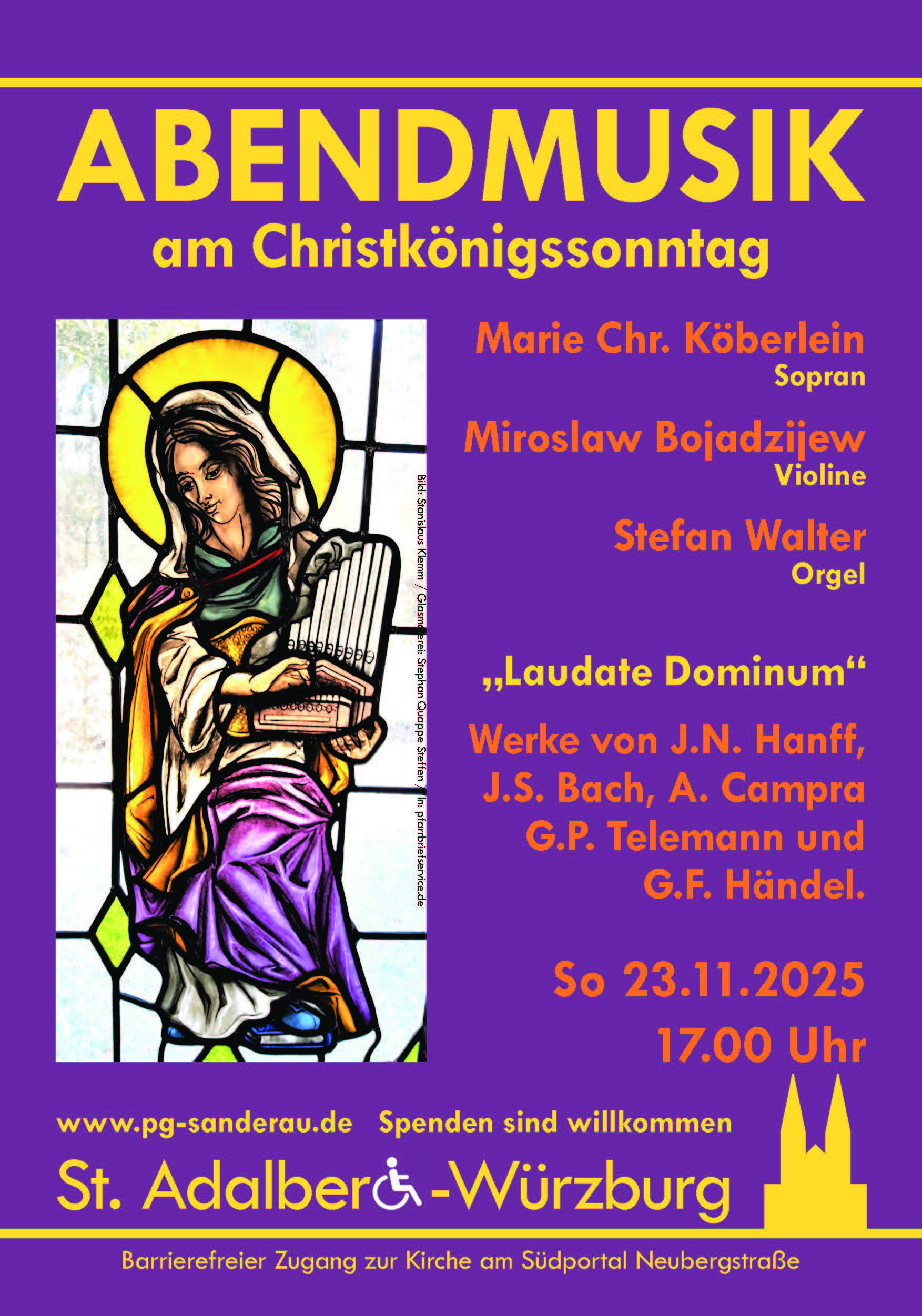 Herzliche Einladung zur Abendmusik am Christkönigssonntag in St. Adalbero! Unter dem Titel "Lautete Dominum" musizieren Marie Christine Köberlein (Sopran), Miroslaw Bojadzijew (Violine) und Stefan Walter (Orgel) Werke von J.S. Bach, G.F. Händel, G.P. Telemann, J.N. Hanff und A. Campra. Beginn ist um 17.00 Uhr, der Eintritt ist frei, eine Spende willkommen. Die Kirche hat einen barrierefreien Zugang am Südportal (Neubergstraße).