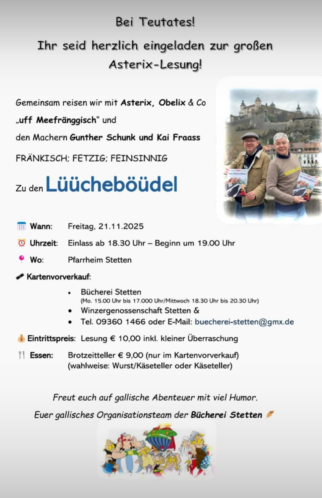 Freut Euch auf eine gemeinsame Reise mit Asterix, Obelix & Co "uff Meefränggisch" und den Machern Guther Schunk und Kai Fraass