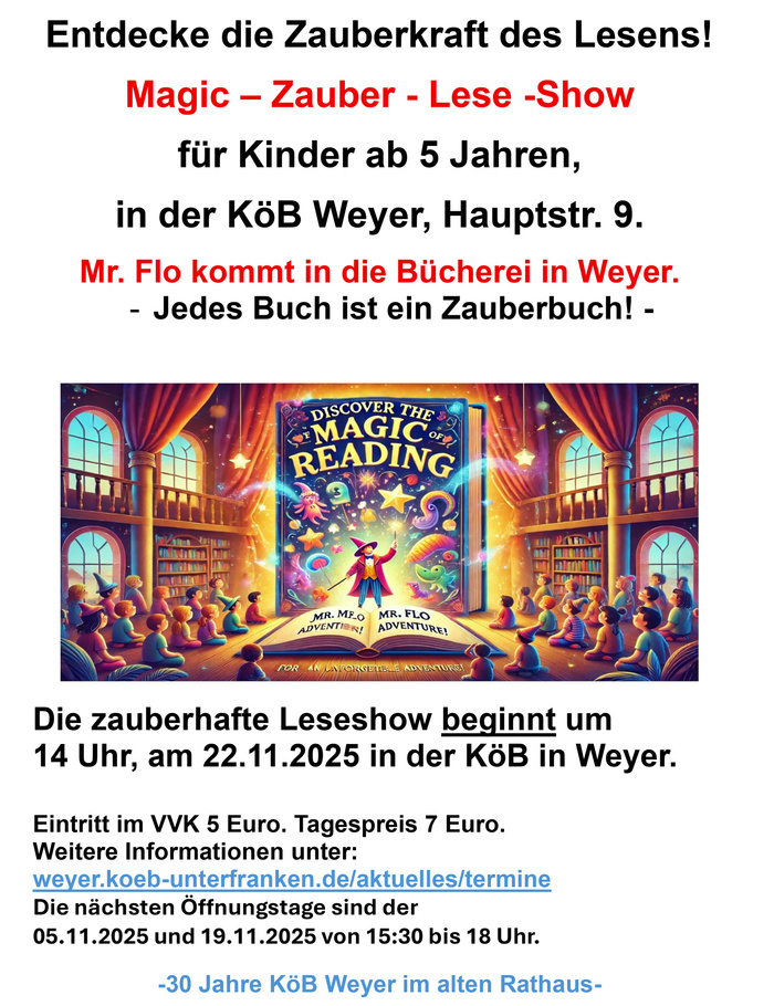 Mr. Flo kommt mit seiner "Magic-Zauber-Lese-Show" in die Bücherei nach Weyer.