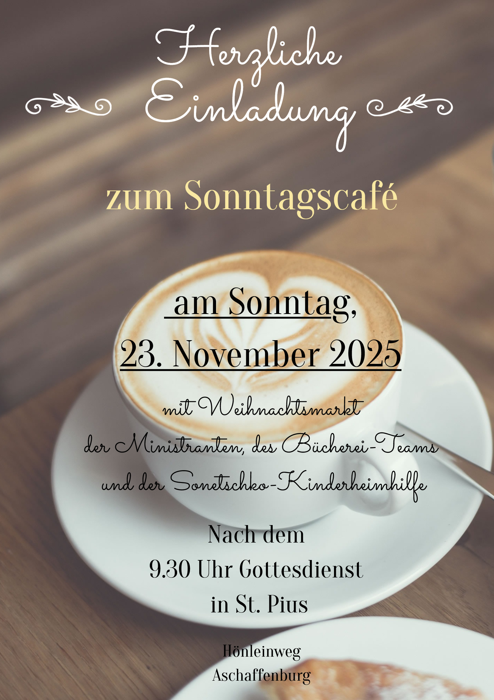 Herzliche Einladung zum Sonntagscafé am 23. November nach dem Gottesdienst im Pfarrsaal von St. Pius. Gegen 10.30 Uhr erwarten wir Sie wieder mit Kaffee und Gebäck. Unsere Ministranten, das Bücherei-Team und die Sonetschko-Kinderheimhilfe laden außerdem zum Adventsmarkt ein.