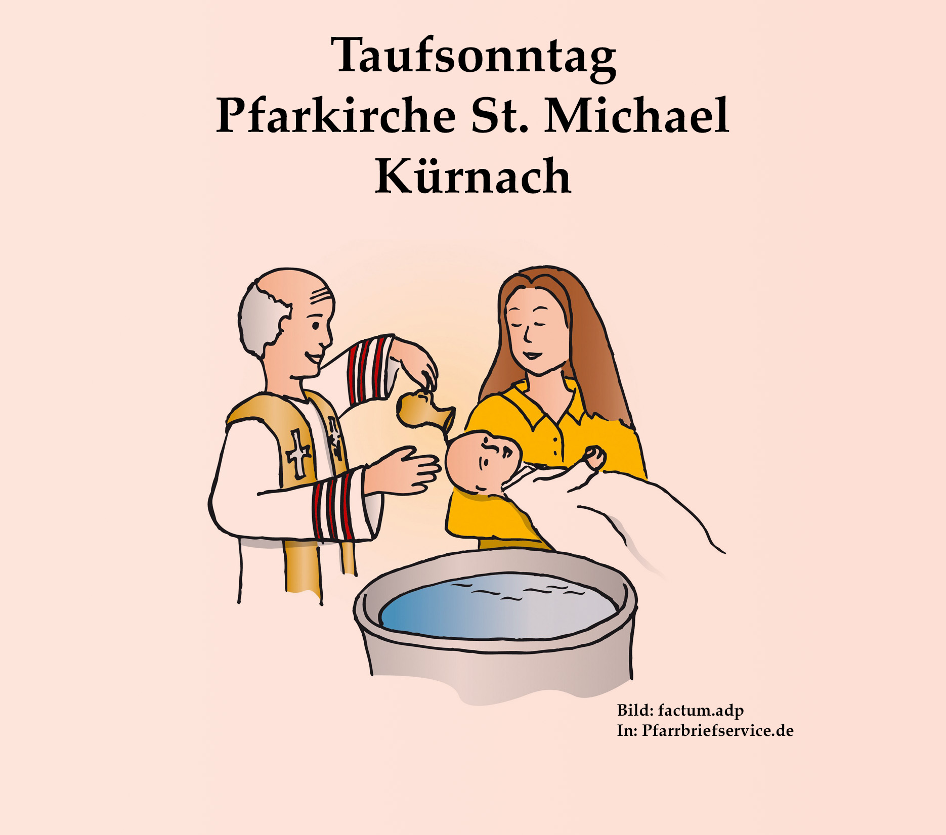 Die Tauffeier findet jeweils im Sonntagsgottesdienst statt. Um Ihr Kind zur Taufe anzumelden, wenden Sie sich an das Pfarrbüro Tel: 09367-99256