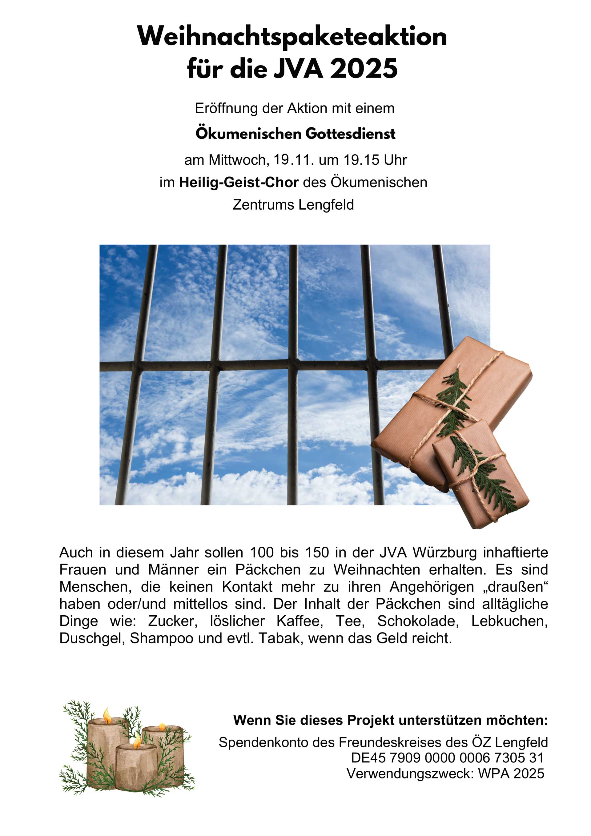 Auch in diesem Jahr sollen 100 bis 150 in der JVA Würzburg inhaftierte Frauen und Männer ein Päckchen zu Weihnachten erhalten. Es sind Menschen, die keinen Kontakt mehr zu ihren Angehörigen „draußen“ haben oder/und mittellos sind. Der Inhalt der Päckchen sind alltägliche Dinge wie: Zucker, löslicher Kaffee, Tee, Schokolade, Lebkuchen, Duschgel, Shampoo und evtl. Tabak, wenn das Geld reicht.